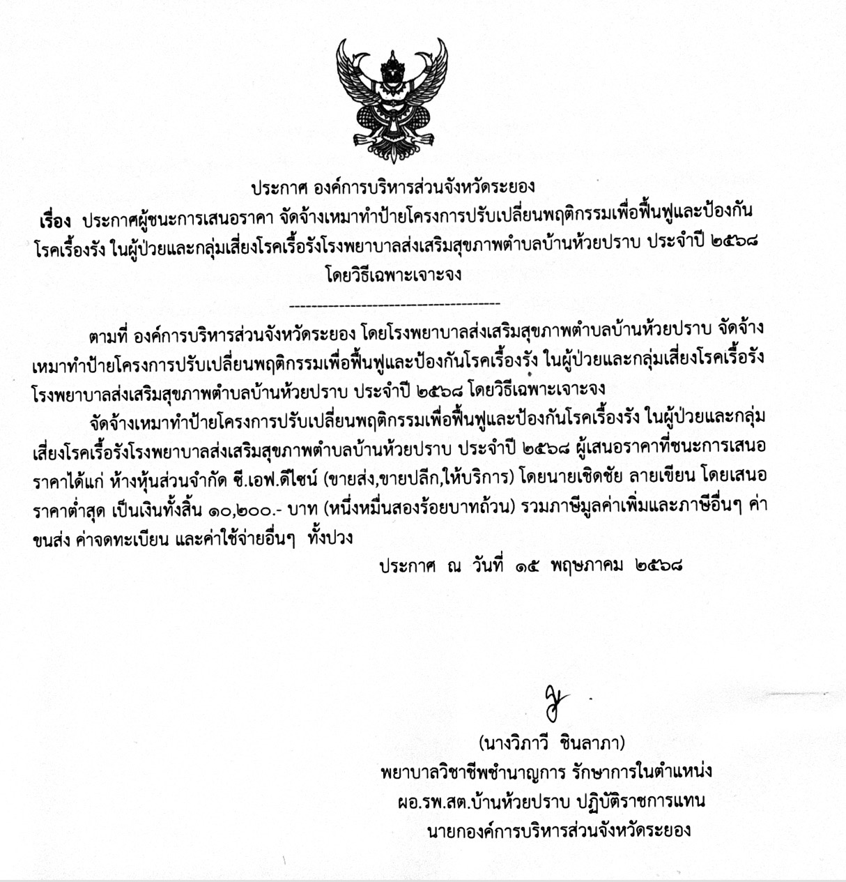 ตามที่ องค์การบริหารส่วนจังหวัดระยอง โดยโรงพยาบาลส่งเสริมสุขภาพตำบลบ้านห้วยปราบ จัดจ้างเหมาทำป้ายโครงการปรับเปลี่ยนพฤติกรรมเพื่อฟื้นฟูและป้องกันโรคเรื้องรัง ในผู้ป่วยและกลุ่มเสี่ยงโรคเรื้อรังโรงพยาบาลส่งเสริมสุขภาพตำบลบ้านห้วยปราบ ประจำปี 2568 โดยวิธีเฉพาะเจาะจง