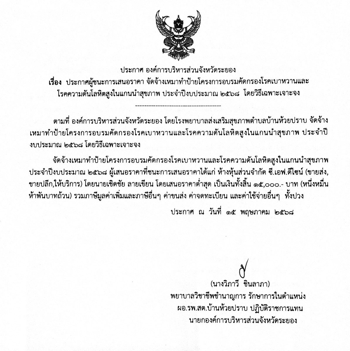 เรื่อง ประกาศผู้ชนะการเสนอราคา จัดจ้างเหมาทำป้ายโครงการอบรมคัดกรองโรคเบาหวานและโรคความดันโลหิตสูงในแกนนำสุขภาพ ประจำปีงบประมาณ 2568 โดยวิธีเฉพาะเจาะจง