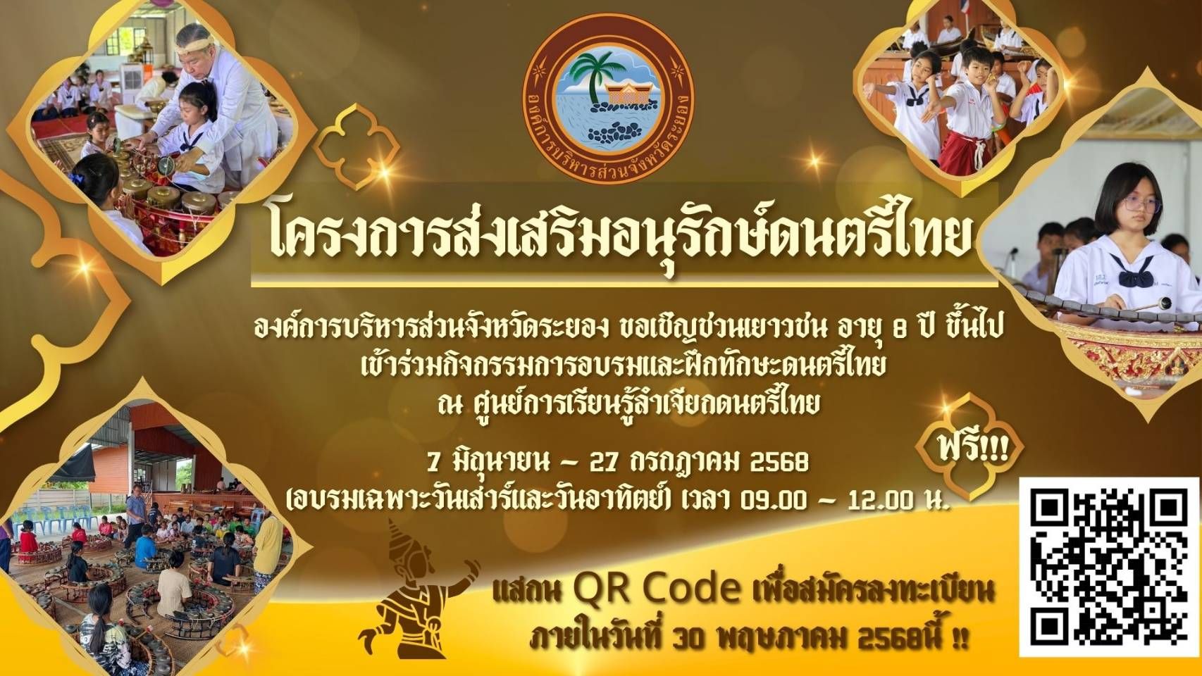 อบจ.ระยอง ขอเชิญชวนเยาวชน อายุ 8 ปีขึ้นไป สมัครอบรมฝึกทักษะดนตรีไทย ฟรี ในระหว่างวันที่ 7 มิถุนายน - 27 กรกฏาคม 2568 อบรมเฉพาะวันเสาร์ - วันอาทิตย์ เวลา 09.00 - 12.00 น.