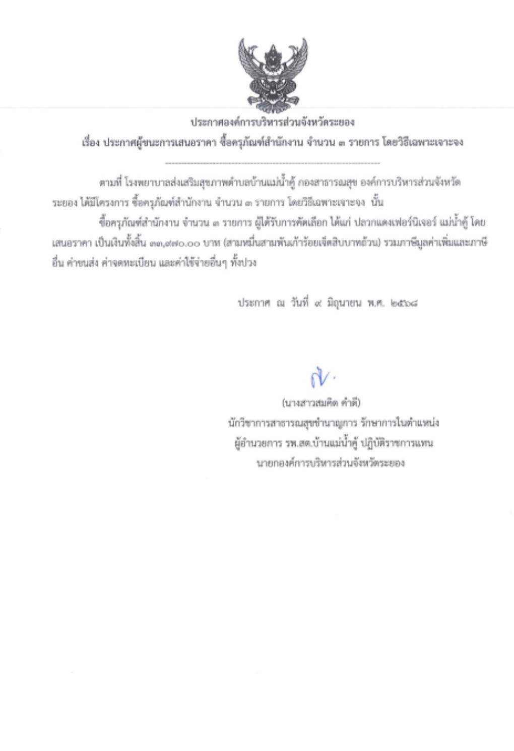รพ.สต.บ้านแม่น้ำคู้ > ประกาศจัดซื้อจัดจ้าง ประกาศผู้ชนะการเสนอราคา ซื้อครุภัณฑ์สำนักงาน จำนวน 3 รายการ โดยวิธีเฉพาะเจาะจง