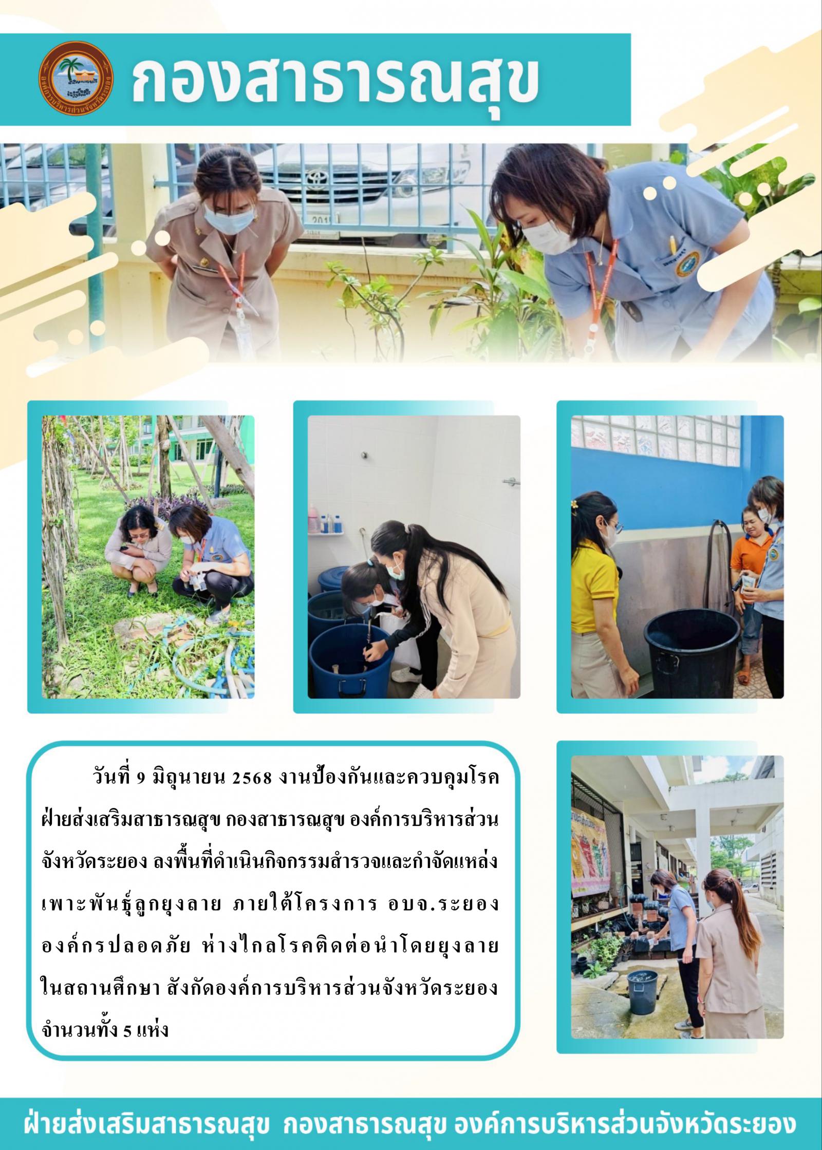 ลงพื้นที่ดำเนินกิจกรรมสำรวจและกำจัดแหล่งเพาะพันธุ์ลูกยุงลาย ภายใต้โครงการ อบจ.ระยอง องค์กรปลอดภัย ห่างไกลโรคติดต่อนำโดยยุงลาย ในสถานศึกษา สังกัดองค์การบริหารส่วนจังหวัดระยอง จำนวนทั้ง 5 แห่ง