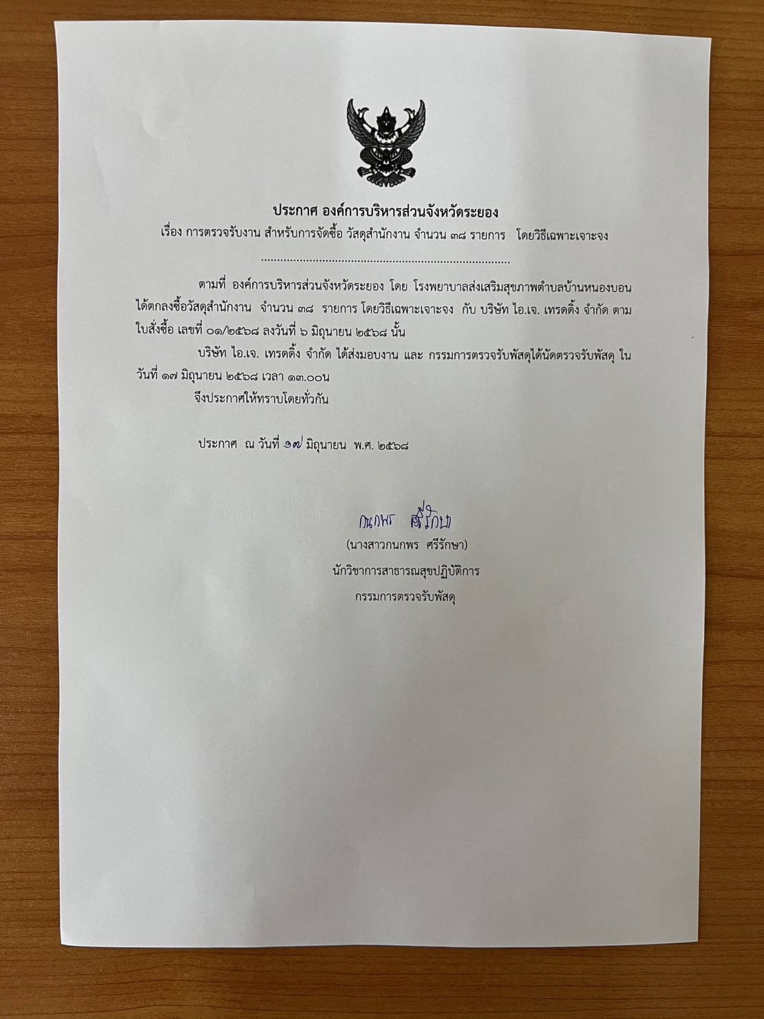 เรื่อง การตรวจรับงาน สำหรับการจัดซื้อ วัสดุสำนักงาน จำนวน 38 รายการ โดยวิธีเฉพาะเจาะจง