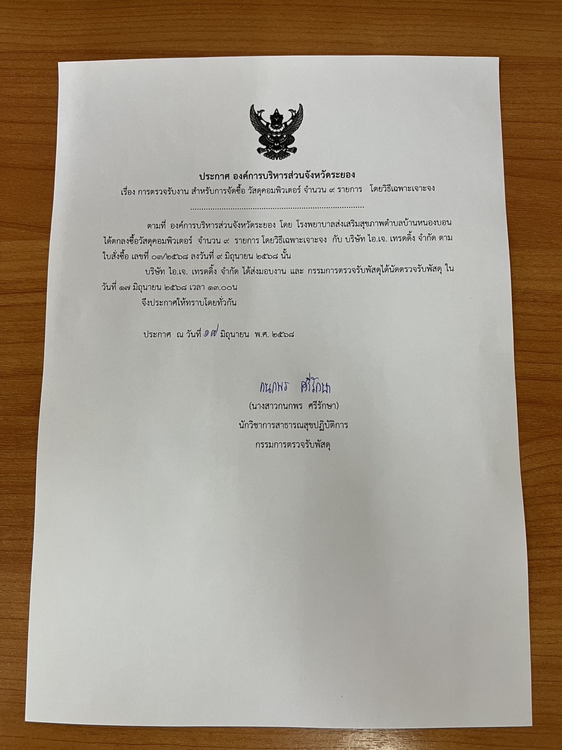 ประกาศ เรื่องการตรวจรับงาน สำหรับการจัดซื้อ วัสดุคอมพิวเตอร์ จำนวน 9 รายการ โดยวิธีเฉพาะเจาะจง