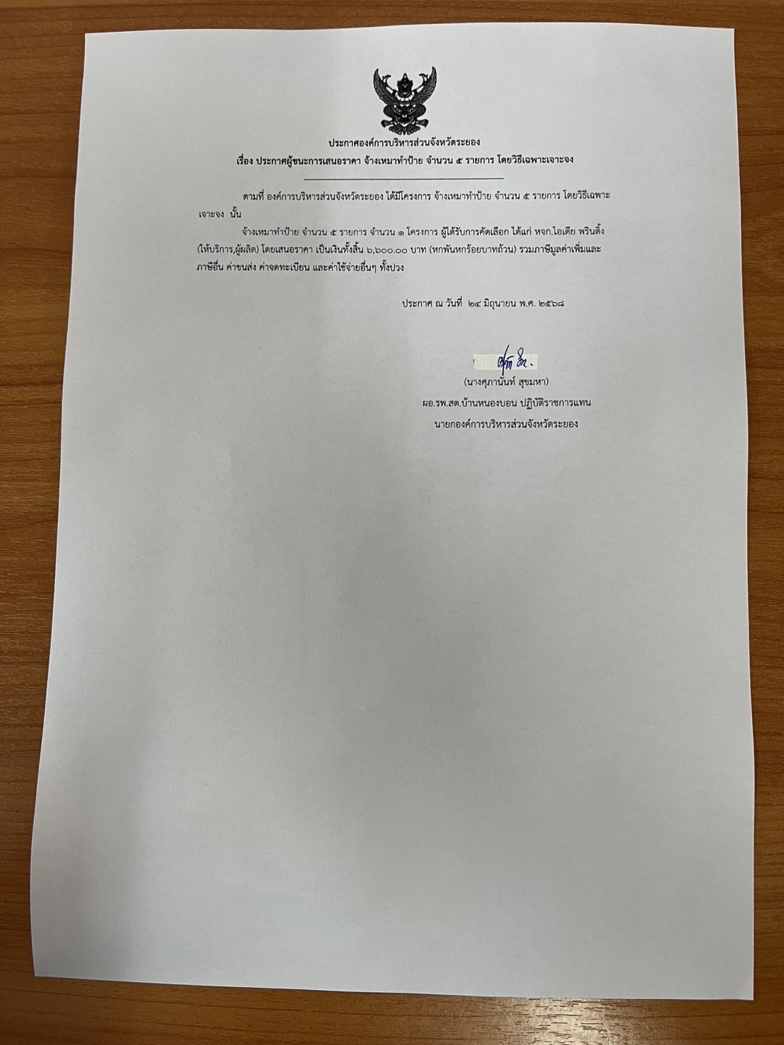 ประกาศผู้ชนะการเสนอราคา จ้างเหมาทำป้าย จำนวน 5 รายการ โดยวิธีเฉพาะเจาะจง