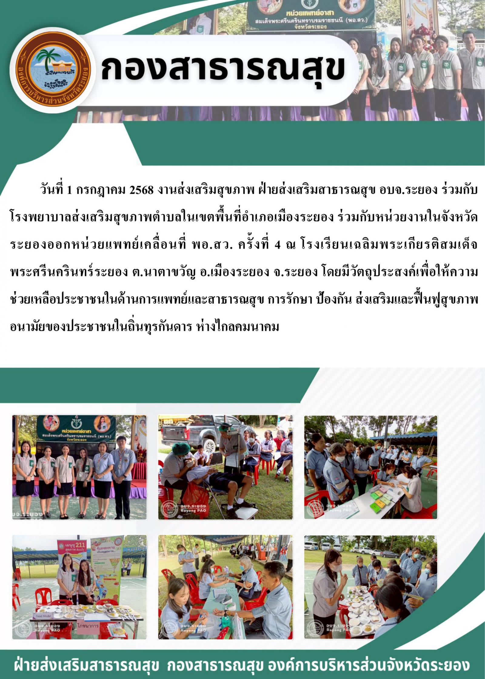 งานส่งเสริมสุขภาพ ฝ่ายส่งเสริมสาธารณสุข อบจ.ระยอง ร่วมกับโรงพยาบาลส่งเสริมสุขภาพตำบลในเขตพื้นที่อำเภอเมืองระยอง ร่วมกับหน่วยงานในจังหวัดระยองออกหน่วยแพทย์เคลื่อนที่ พอ.สว. ครั้งที่ 4