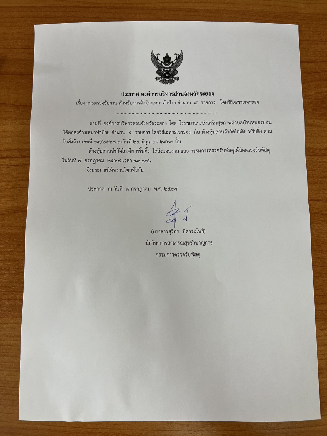 ประกาศ การตรวจรังาน สำหรับการจัดจ้างเหมาทำป้าย จำนวน 5 รายการ โดยวิธีเฉพาะเจาะจง