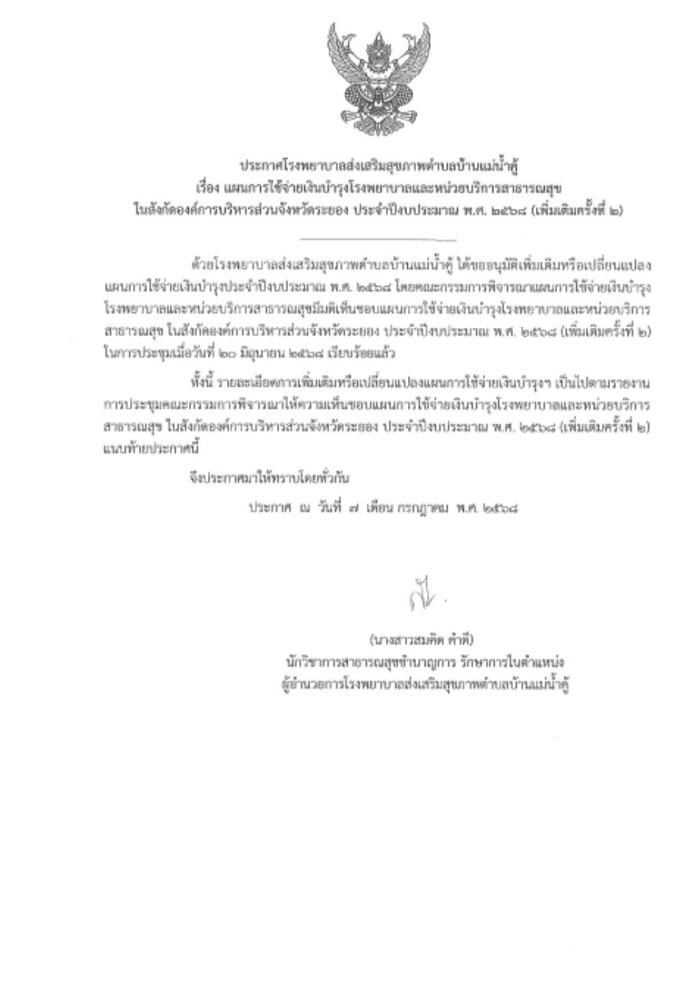 ประกาศโรงพยาบาลส่งเสริมสุขภาพตำบลบ้านแม่น้ำคู้ เรื่อง แผนการใช้จ่ายเงินบำรุงโรงพยาบาลและหน่วยบริการสาธารณสุข ในสังกัดองค์การบริหารส่วนจังหวัดระยอง ประจำปีงบประมาณ พ.ศ. 2568 (เพิ่มเติมครั้งที่ 2)
