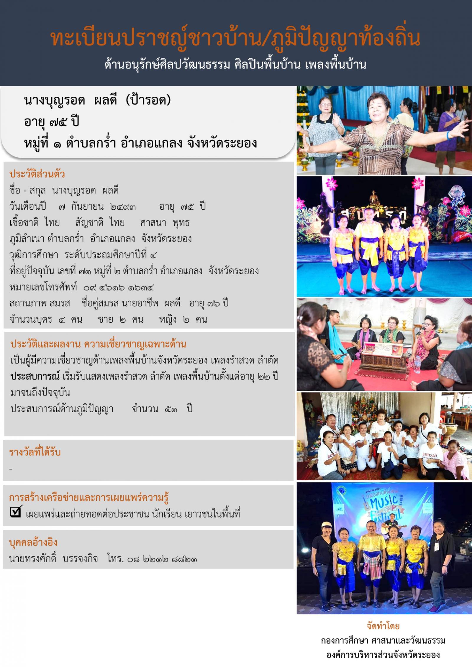 กองการศึกษา ศาสนาและวัฒนธรรม ได้จัดทำทะเบียนปราชญ์ชาวบ้าน/ภูมิปัญญาท้องถิ่นขึ้น เพื่อนำไปเผยแพร่ให้เกิดประโยชน์กับเด็ก เยาวชน ชุมชน ประชาชนในจังหวัดระยอง และประชาชนทั่วไป ได้ศึกษา เรียนรู้ต่อยอด สืบสาน อนุรักษ์ภูมิปัญญาท้องถิ่นที่สำคัญและมีประโยชน์ไว้ไม่ให้สูญหายไปจากจังหวัดระยอง