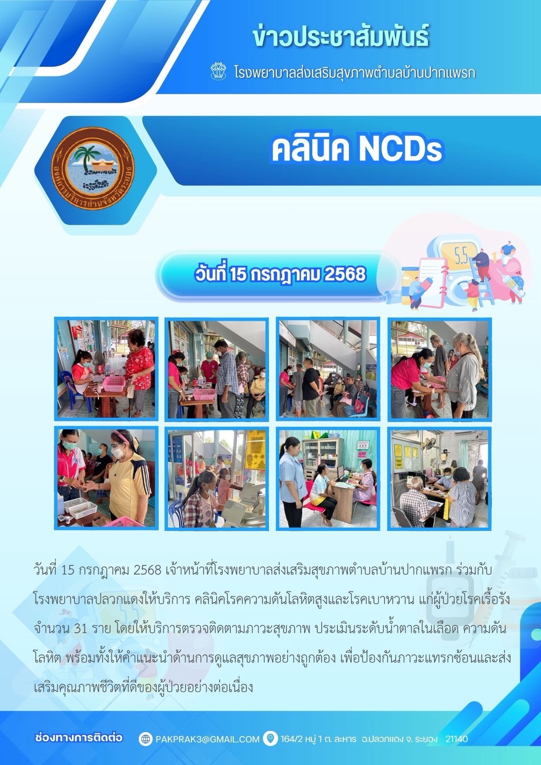 วันที่ 15 กรกฎาคม 2568 รพ.สต.บ้านปากแพรก ร่วมกับ รพ.ปลวกแดง ให้บริการคลินิกเบาหวาน / ความดัน แก่ผู้ป่วยโรคเรื้อรัง จำนวน 31 ราย