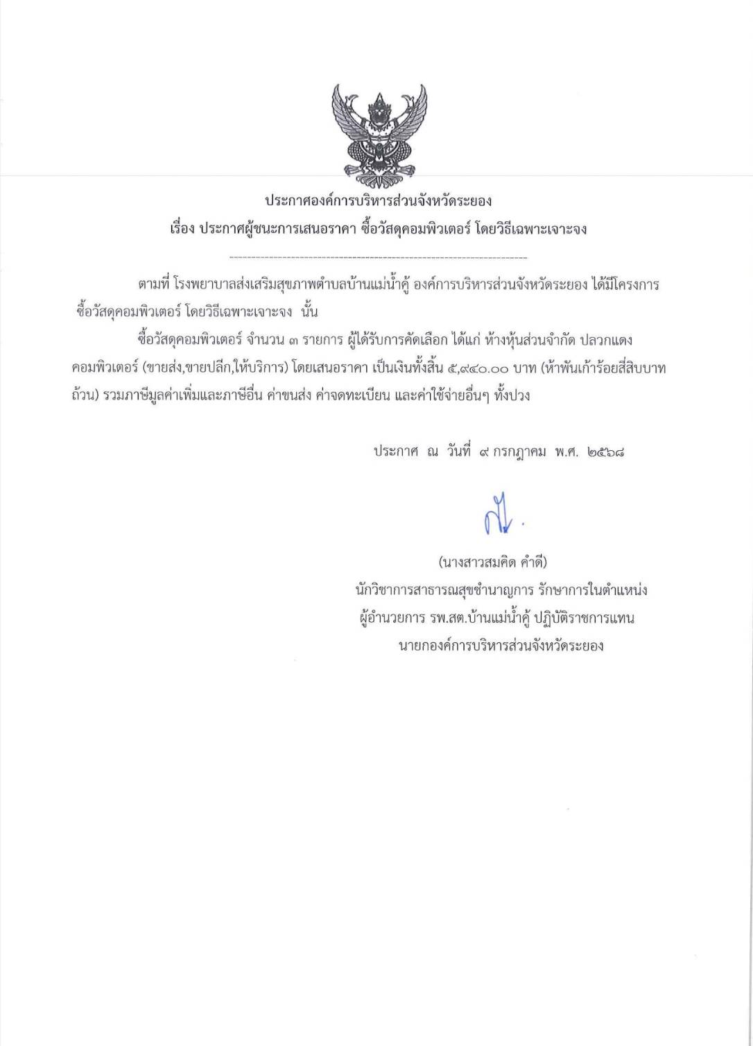 รพ.สต.บ้านแม่น้ำคู้ > ประกาศจัดซื้อจัดจ้าง ประกาศผู้ชนะการเสนอราคา จัดซื้อวัสดุคอมพิวเตอร์ จำนวน 3 รายการ โดยวิธีเฉพาะเจาะจง