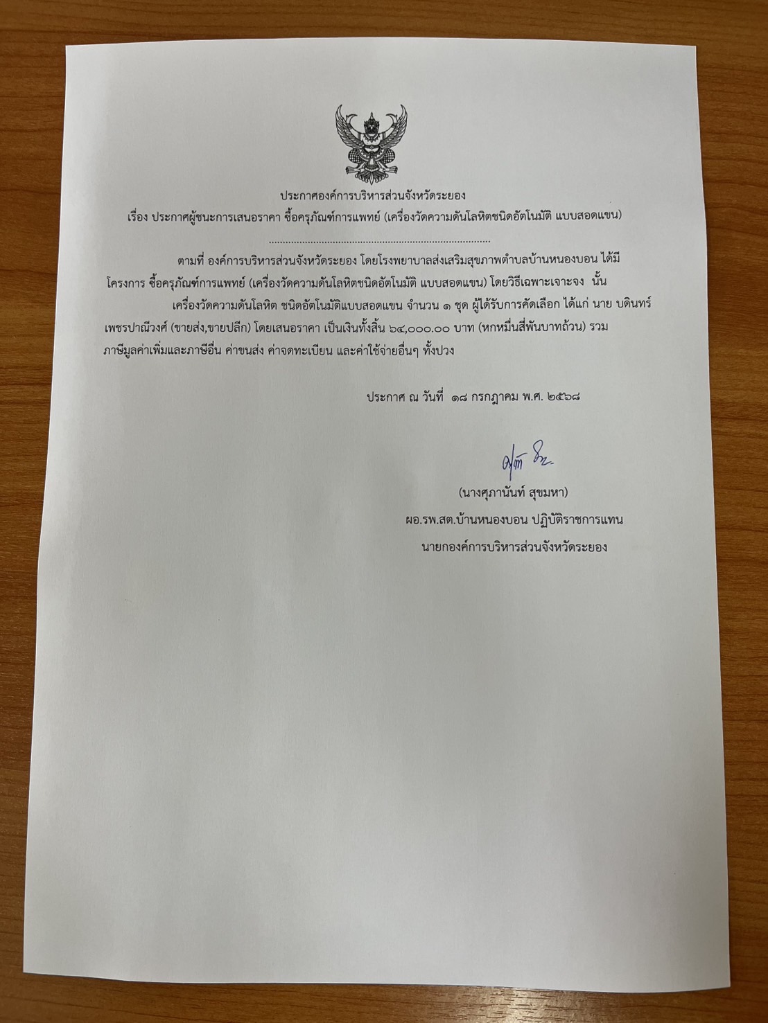 ประกาศผู้ชนะการเสนอราคา ซื้อครุภัณฑ์การแพทย์ (เครื่องวัดความดันโลหิตชนิดอัตโนมัติ)