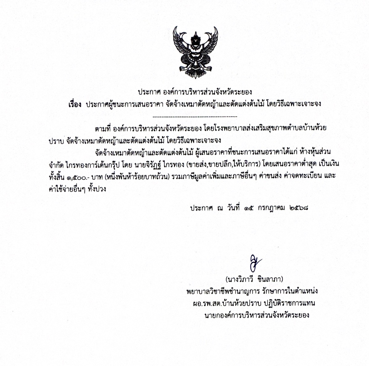 ประกาศ องค์การบริหารส่วนจังหวัดระยอง เรื่อง ประกาศผู้ชนะการเสนอราคา จัดจ้างเหมาตัดหญ้าและตัดแต่งต้นไม้ โดยวิธีเฉพาะเจาะจง