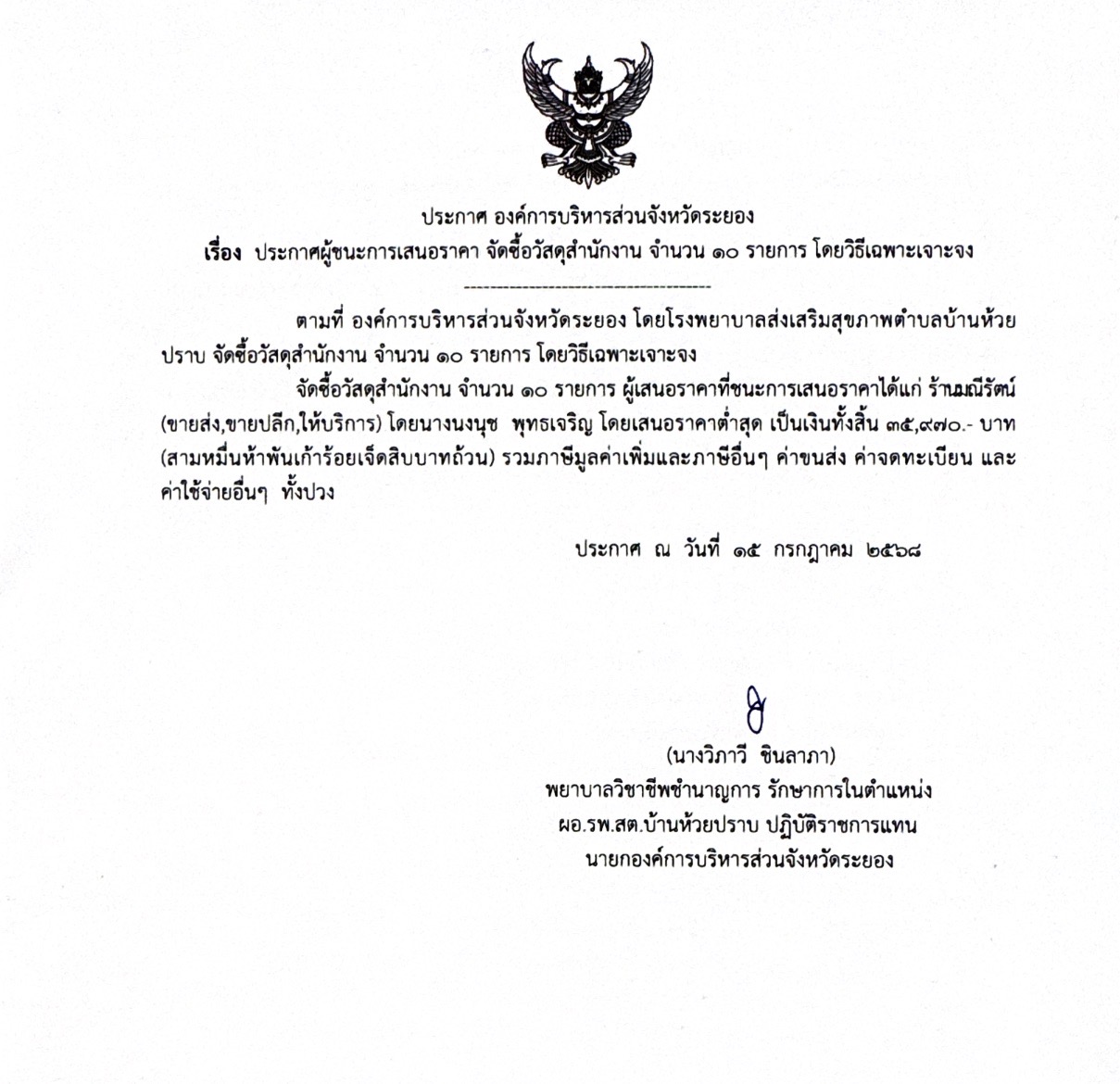 ตามที่ องค์การบริหารส่วนจังหวัดระยอง โดยโรงพยาบาลส่งเสริมสุขภาพตำบลบ้านห้วยปราบ จัดซื้อวัสดุสำนักงาน จำนวน 10 รายการ โดยวิธีเฉพาะเจาะจง