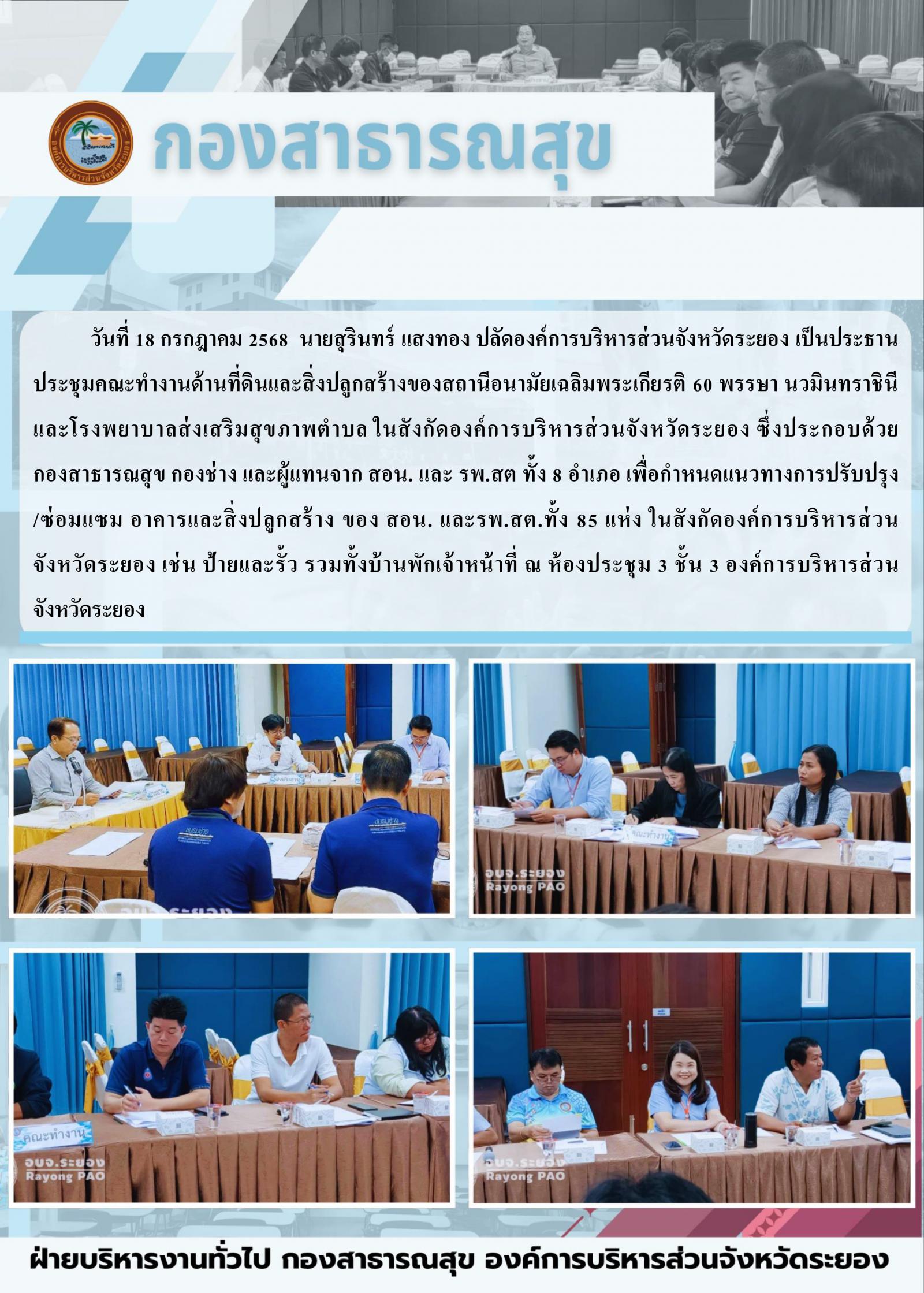 กองสาธารณสุข ประชุมคณะทำงานด้านที่ดินและสิ่งปลูกสร้างของสถานีอนามัยเฉลิมพระเกียรติ 60 พรรษา นวมินทราชินี และโรงพยาบาลส่งเสริมสุขภาพตำบล ในสังกัดองค์การบริหารส่วนจังหวัดระยอง ครั้งที่ 2 / 2568