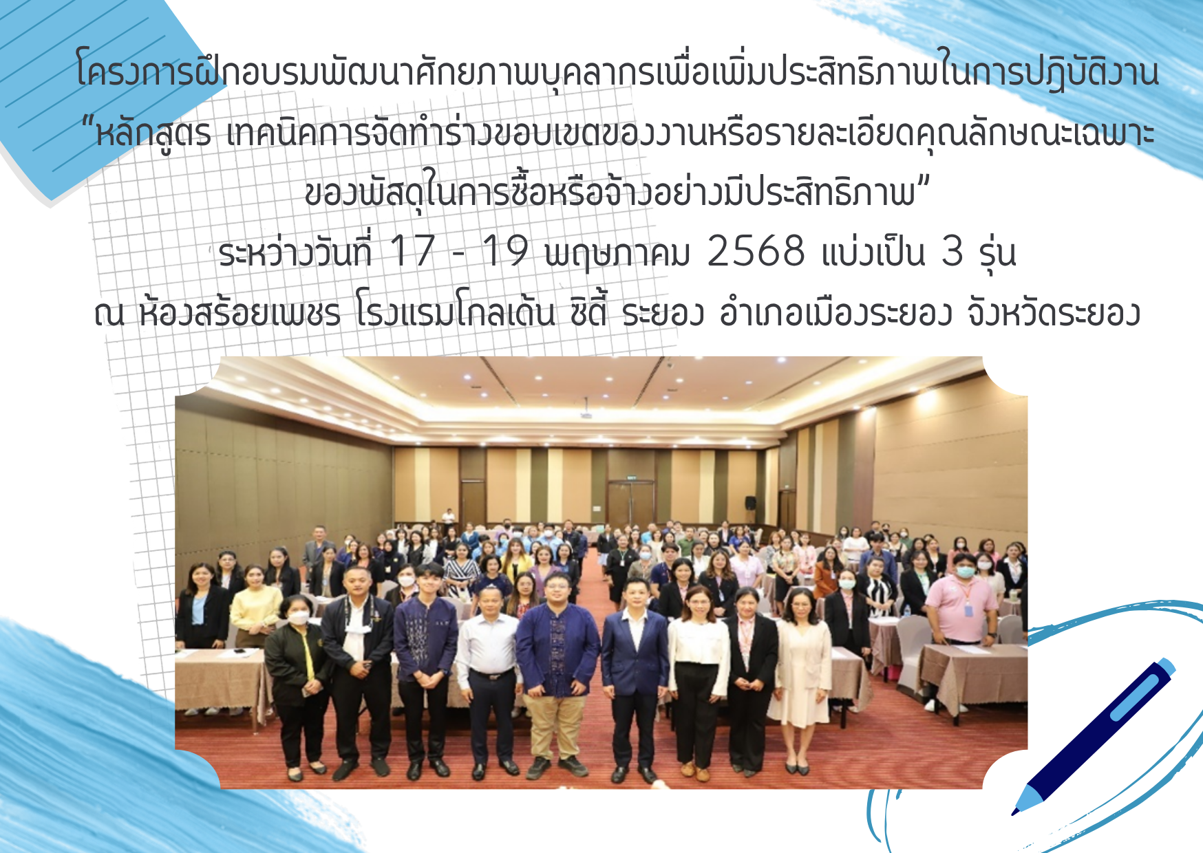 โครงการฝึกอบรมพัฒนาศักยภาพบุคลากรเพื่อเพิ่มประสิทธิภาพในการปฏิบัติงาน “หลักสูตร เทคนิคการจัดทำร่างขอบเขตของงานหรือรายละเอียดคุณลักษณะเฉพาะ ของพัสดุในการซื้อหรือจ้างอย่างมีประสิทธิภาพ” ระหว่างวันที่ 17 - 19 พฤษภาคม 2568 แบ่งเป็น 3 รุ่น ณ ห้องสร้อยเพชร โรงแรมโกลเด้น ซิตี้ ระยอง อำเภอเมืองระยอง จังหวัดระยอง