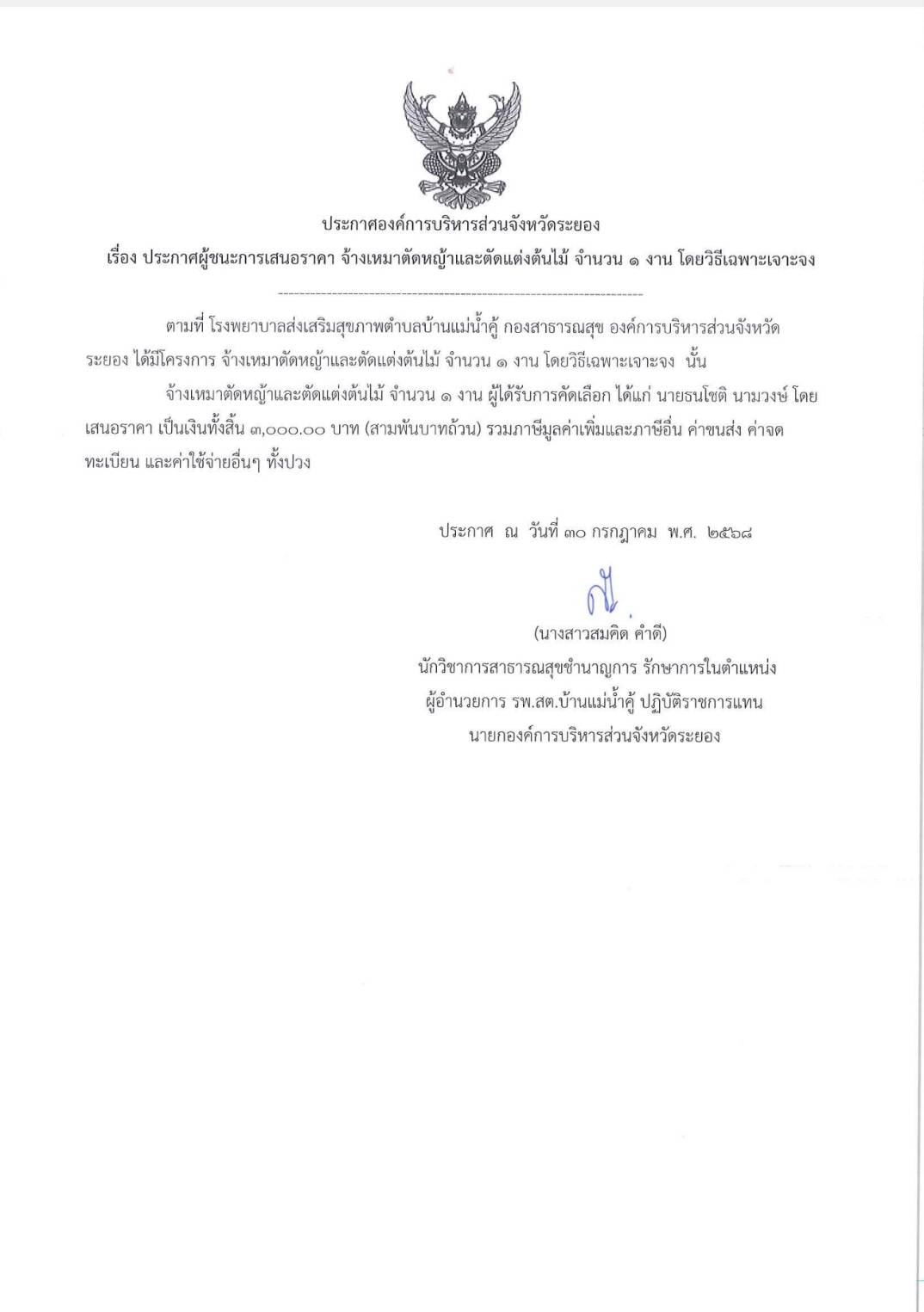 ประกาศผู้ชนะการเสนอราคา จ้างเหมาตัดหญ้าและตัดแต่งต้นไม้ จำนวน 1 งาน โดยวิธีเฉพาะเจาะจง
