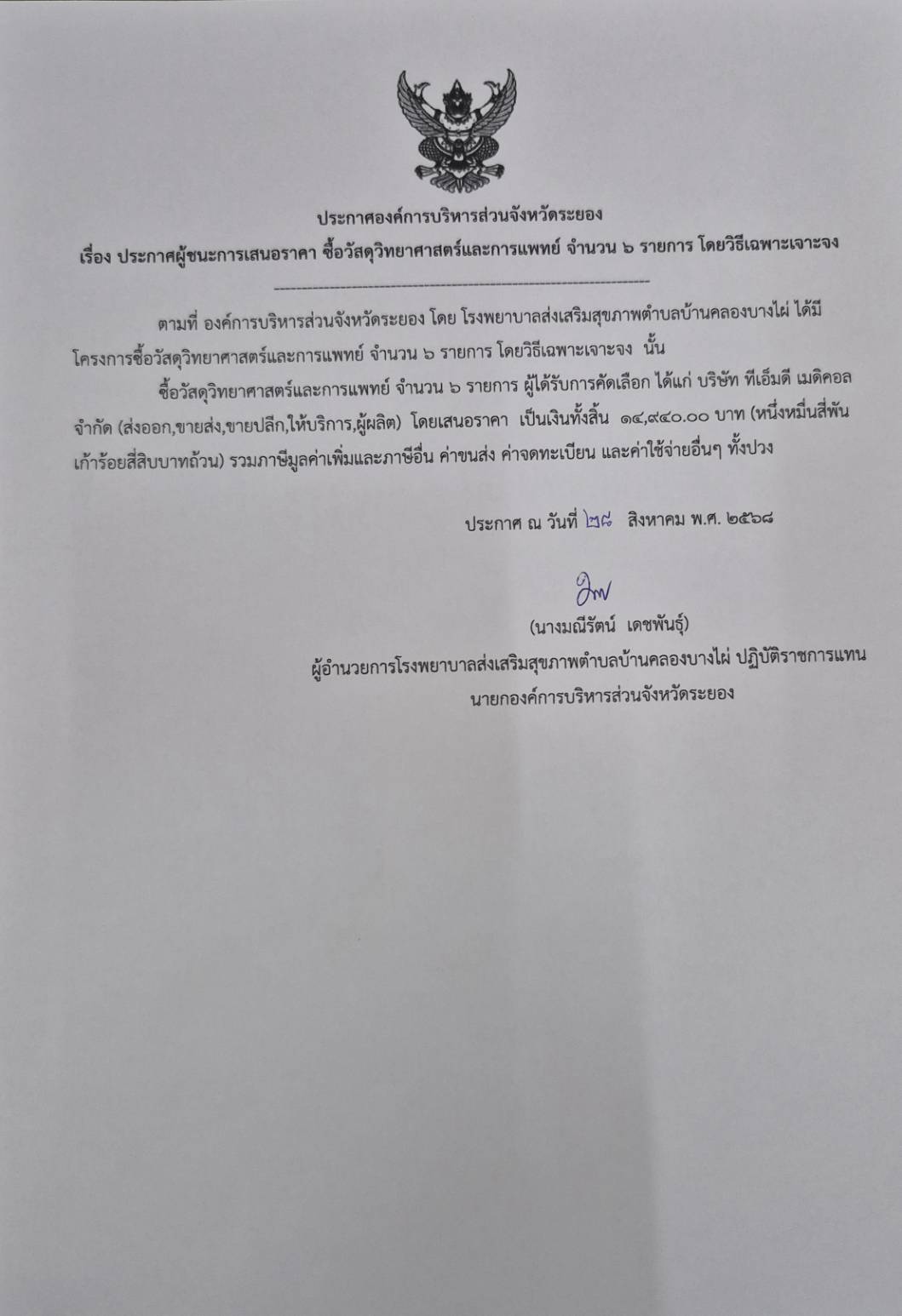รพ.สต.บ้านคลองบางไผ่ > ข่าวสาร ประกาศ ประกาศผู้ชนะการเสนอราคา ซื้อวัสดุวิทยาศาสตร์และการแพทย์ จำนวน 6 รายการ โดยวิธีเฉพาะเจาะจง