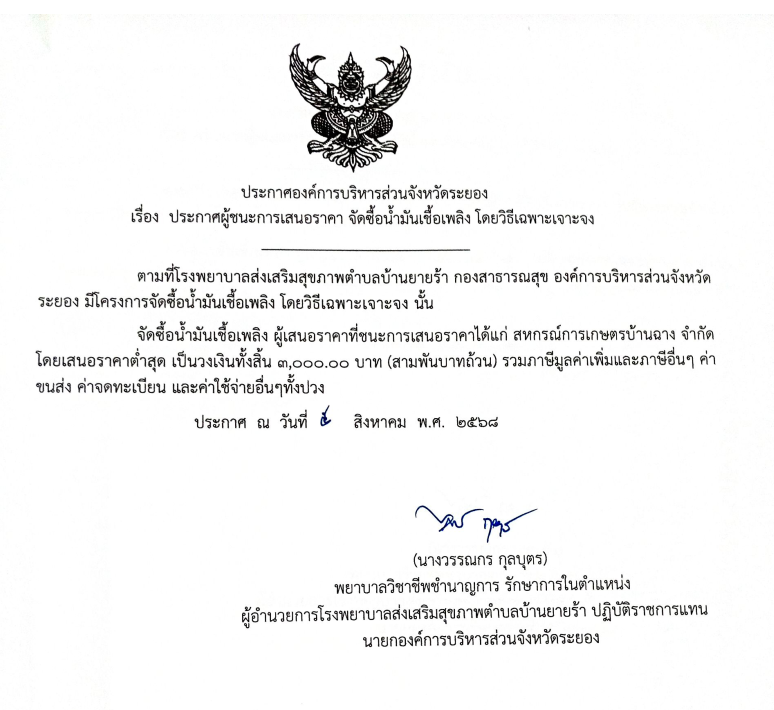 โรงพยาบาลส่งเสริมสุขภาพตำบลบ้านยายร้า > ข่าวประชาสัมพันธ์ ประกาศผู้ชนะการเสนอราคา จัดซื้อน้ำมันเชื้อเพลิง โดยวิธีเฉพาะเจาะจง