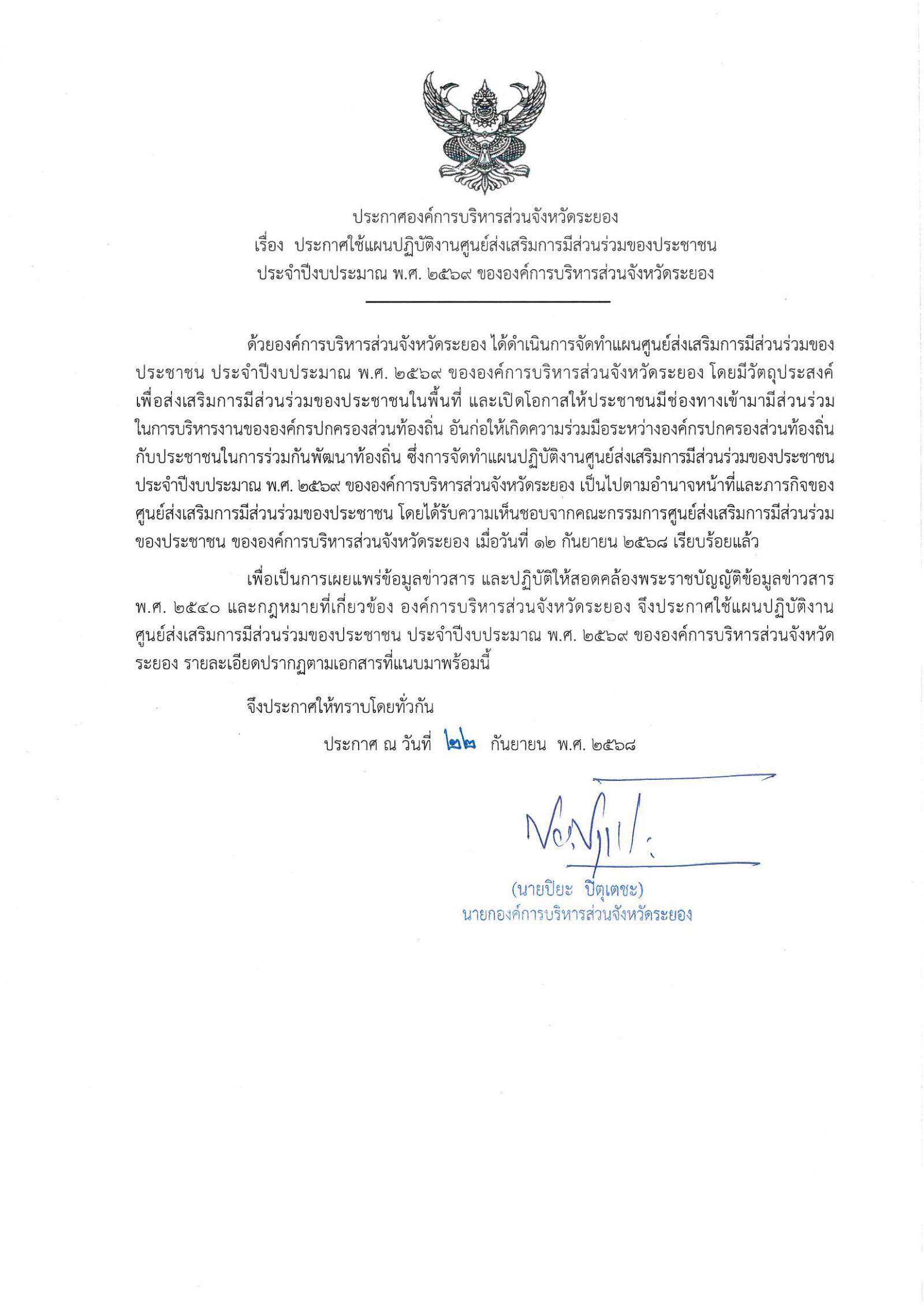 แผนการปฏิบัติงานศูนย์ส่งเสริมการมีส่วนร่วมของประชาชน ประจำปีงบประมาณ ๒๕๖๙