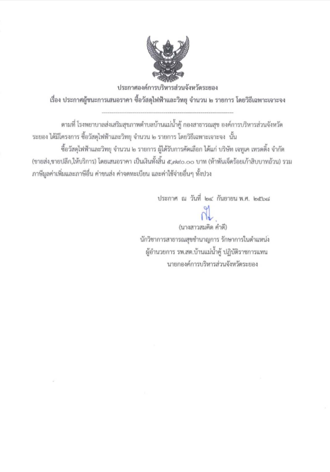 รพ.สต.บ้านแม่น้ำคู้ > ประกาศจัดซื้อจัดจ้าง ประกาศผู้ชนะการเสนอราคา ซื้อวัสดุไฟฟ้าและวิทยุ จำนวน ๒ รายการ โดยวิธีเฉพาะเจาะจง