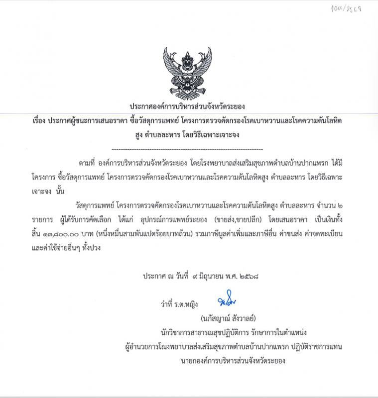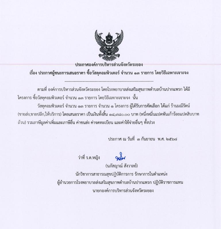 รพ.สต.บ้านปากแพรก > จัดซื้อจัดจ้าง ประกาศผู้ชนะการเสนอราคา ซื้อวัสดุสำนักงาน จำนวน 5 รายการ โดยวิธีเฉพาะเจาะจง