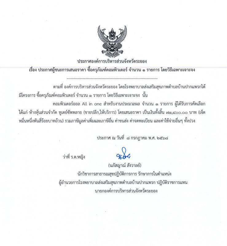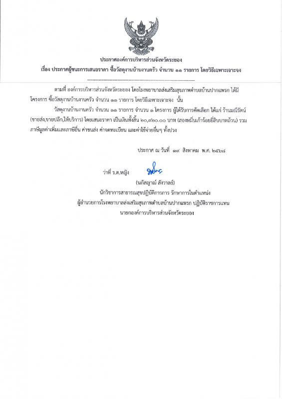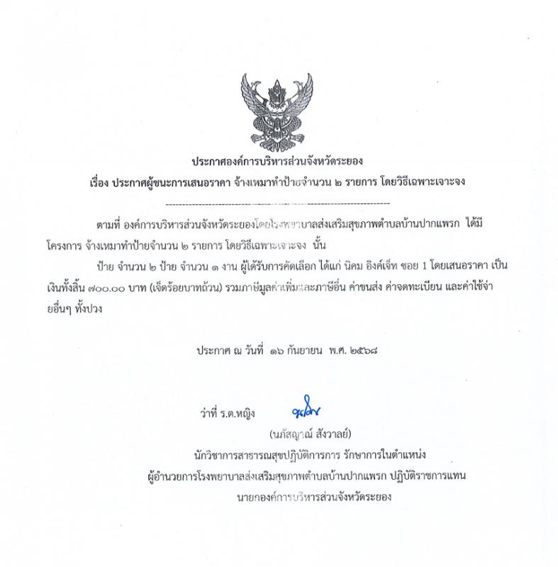 ประกาศผู้ชนะการเสนอราคา จ้างเหมาทำตรายาง จำนวน 2 รายการ โดยวิธีเฉพาะเจาะจง