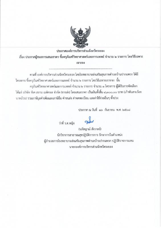 ประกาศผู้ชนะการเสนอราคา ซื้อครุภัณฑ์ทางการแพทย์ จำนวน 3 รายการ โดยวิธีเฉพาะเจาะจง