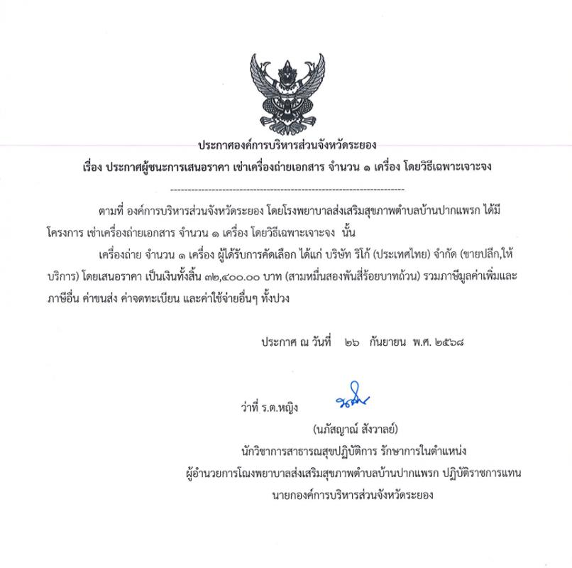 ประกาศผู้ชนะการเสนอราคา เช่าเครื่องเอกสารจำนวน 1 เครื่อง โดยวิธีเฉพาะเจาะจง