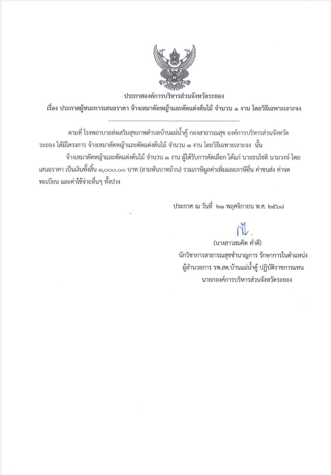 รพ.สต.บ้านแม่น้ำคู้ > ประกาศจัดซื้อจัดจ้าง ประกาศผู้ชนะการเสนอราคา จ้างเหมาตัดหญ้าและตัดแต่งต้นไม้ จำนวน ๑ งาน โดยวิธีเฉพาะเจาะจง