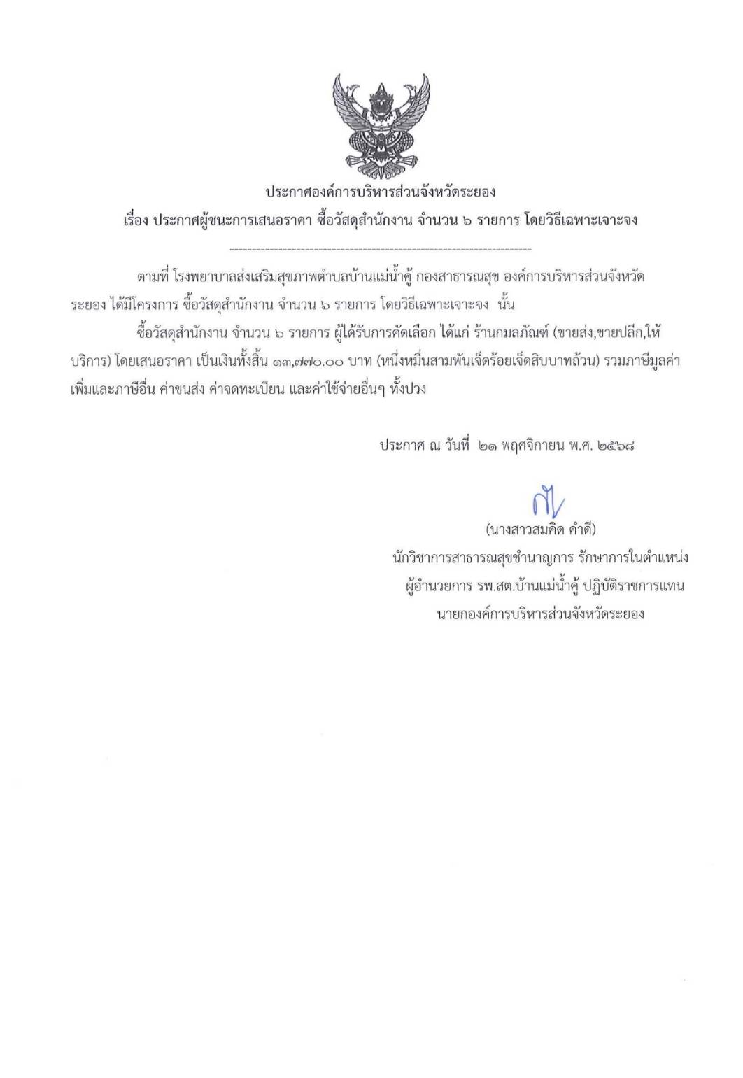 รพ.สต.บ้านแม่น้ำคู้ > ประกาศจัดซื้อจัดจ้าง ประกาศผู้ชนะการเสนอราคา จัดซื้อวัสดุสำนักงาน โดยวิธีเฉพาะเจาะจง