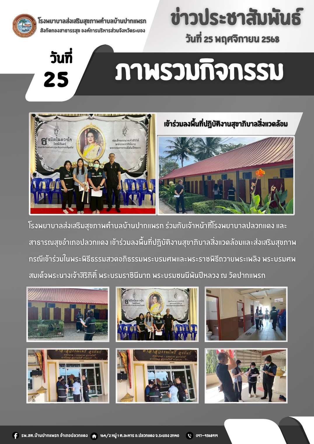 วันที่ 25 พฤศจิกายน 2568 รพ.สต.บ้านปากแพรก ร่วมกับ จนท.รพ.ปลวกแดง และ สสอ.ปลวกแดง เข้าร่วมลงพื้นที่ปฏิบัติงานสุขาภิบาลสิ่งแวดล้อมและส่งเสริมสุขภาพ ณ วัดปากแพรก