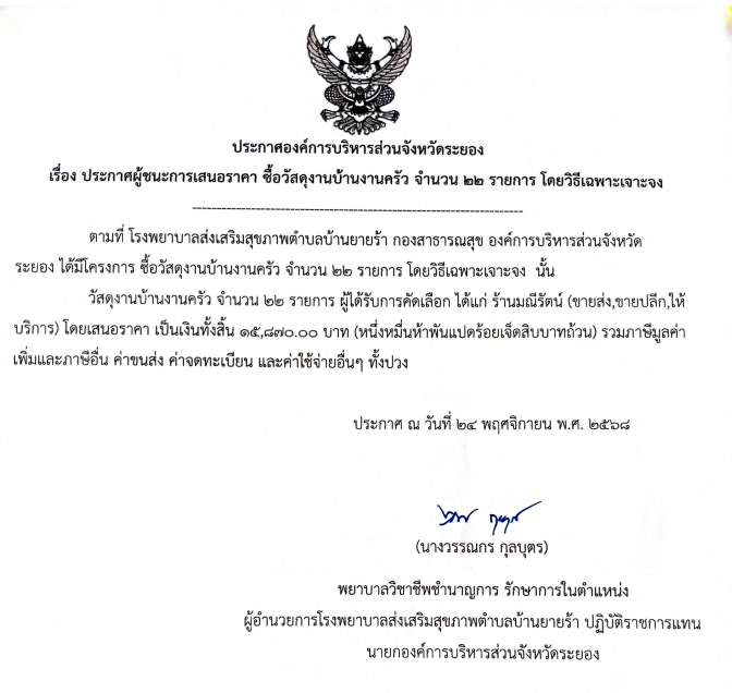 โรงพยาบาลส่งเสริมสุขภาพตำบลบ้านยายร้า > ข่าวประชาสัมพันธ์ ประกาศผู้ชนะการเสนอราคา ซื้อวัสดุงานบ้านงานครัว โดยวิธีเฉพาะเจาะจง