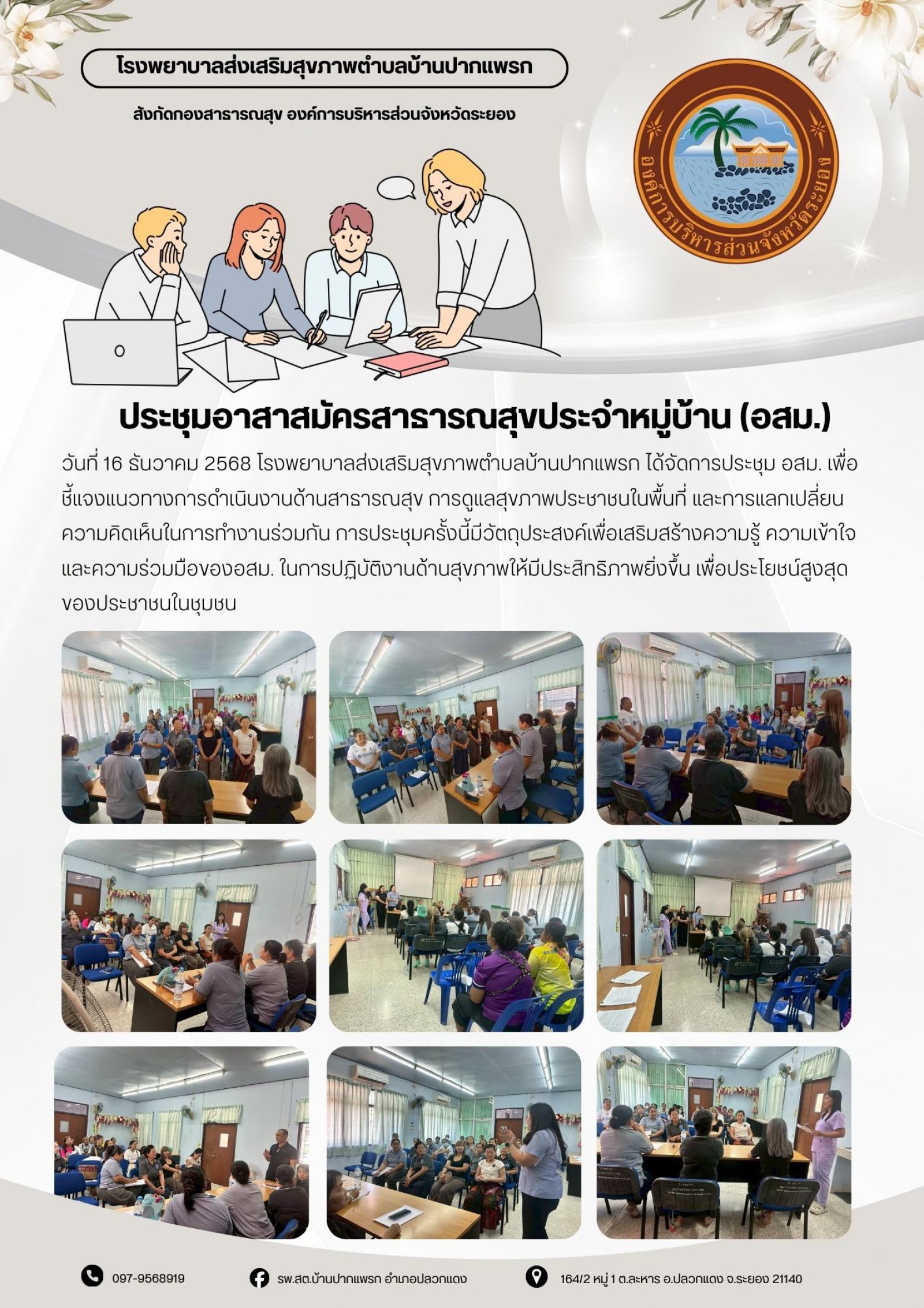 วีนที่ 16 ธันวาคม 2568 รพ.สต.บ้านปากแพรก จัดการประชุม อสม.เพื่อชี้แจงแนวทางการดำเนินงานด้านสาธารณสุข การดูแลประชาชนในพื้นที่ และการแลกเปลี่ยนความคิดเห็นในการทำงานร่วมกัน