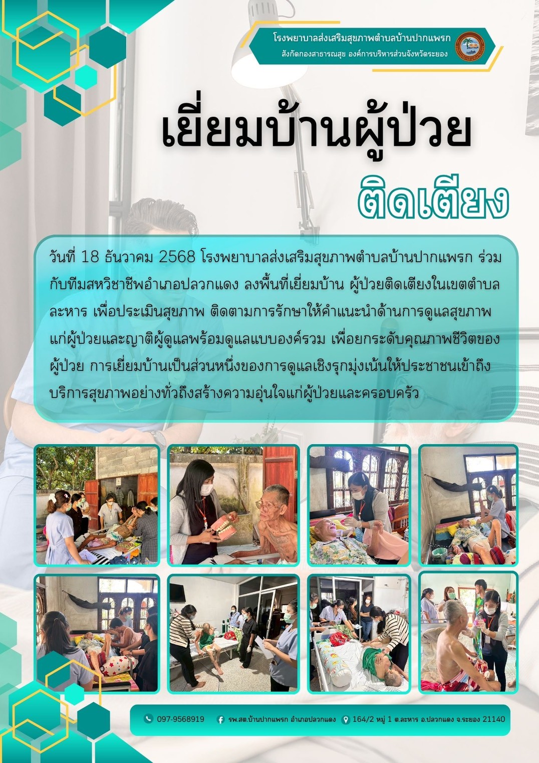วันที่ 18 ธันวาคม 2568 รพ.สต.บ้านปากแพรก ร่วมกับทีมสหวิชาชีพอำเภอปลวกแดง ลงพื้นที่เยี่ยมบ้าน ผู้ป่วยติดเตียงในเขตตำบลละหาร เพื่อประเมินสุขภาพ ติดตามการรักษาและให้คำแนะนำด้านสุขภาพ