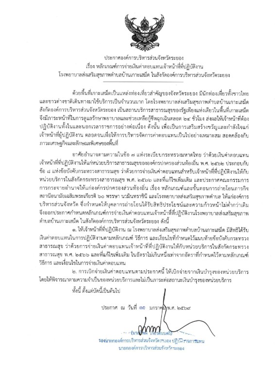 หลักเกณฑ์การจ่ายเงินค่าตอบแทนเจ้าหน้าที่ที่ปฏิบัติงาน โรงพยาบาลส่งเสริมสุขภาพตำบลบ้านเกาะเสม็ด ในสังกัดองค์การบริหารส่วนจังหวัดระยอง