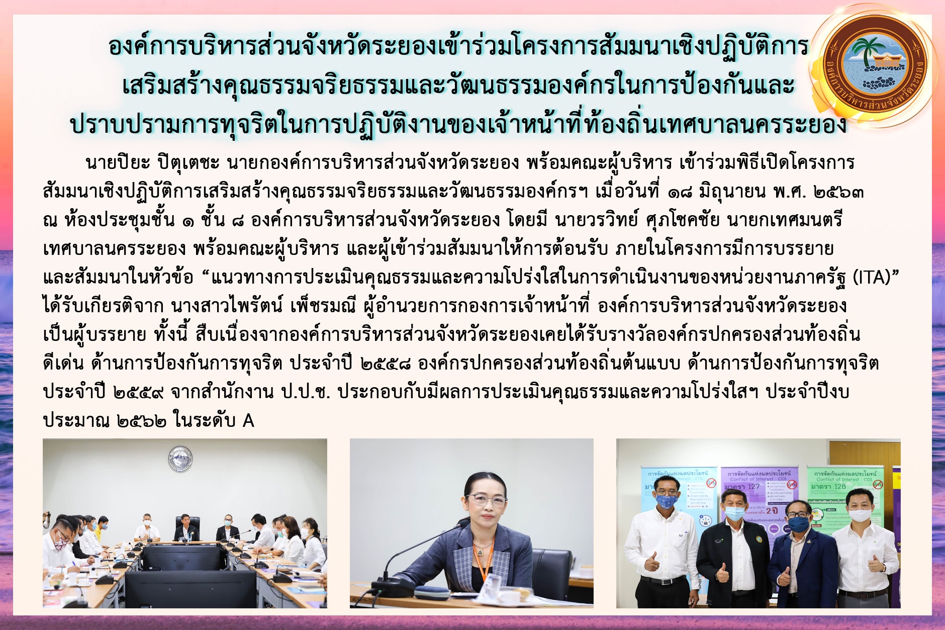 อบจ.ระยอง เข้าร่วมโครงการสัมมนาเชิงปฏิบัติการเสริมสร้างคุณธรรมจริยธรรมและวัฒนธรรมองค์กรในการป้องกันและปราบปรามการทุจริตในการปฏิบัติงานของเจ้าหน้าที่ท้องถิ่นเทศบาลนครระยอง ประจำปีงบประมาณ 2563