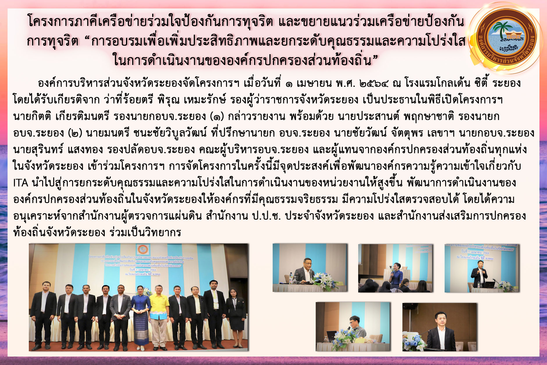 โครงการภาคีเครือข่ายร่วมใจป้องกันการทุจริต และขยายแนวร่วมเครือข่ายป้องกันการทุจริต “การอบรมเพื่อเพิ่มประสิทธิภาพและยกระดับคุณธรรมและความโปร่งใสในการดำเนินงานขององค์กรปกครองส่วนท้องถิ่นในจังหวัดระยอง”