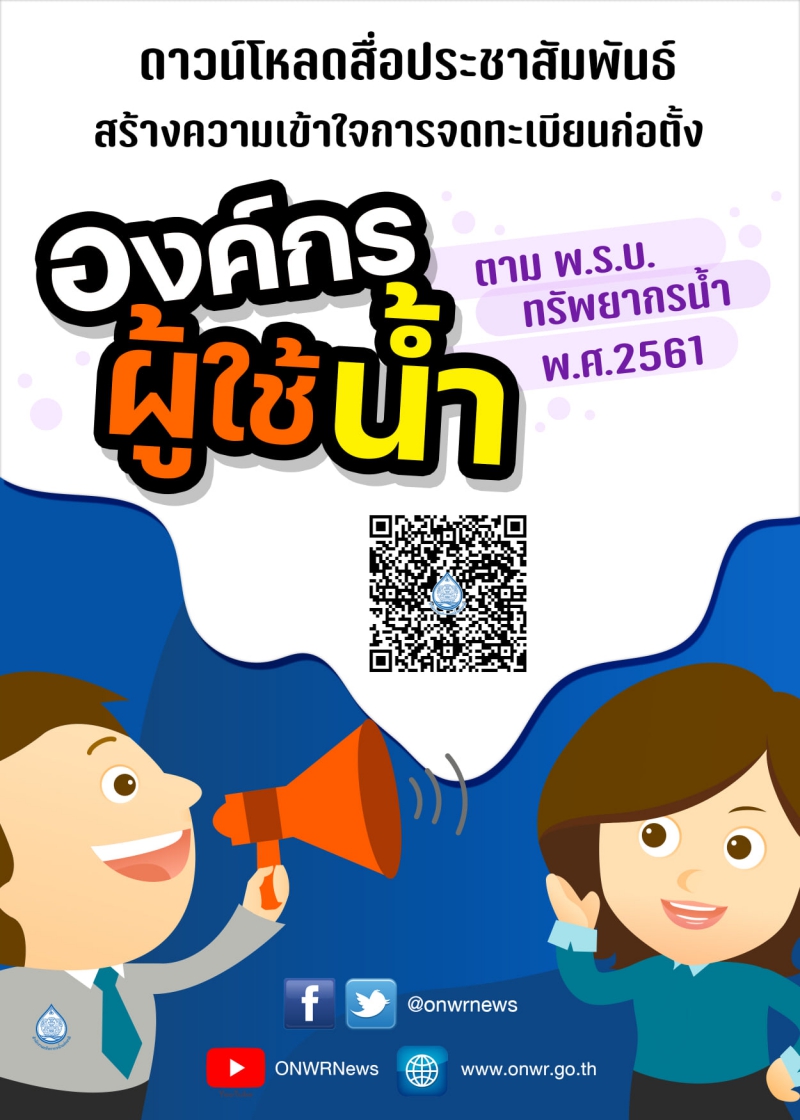 สำนักงานทรัพยากรน้ำแห่งชาติ (สทนช.) ได้ดำเนินการอัพเดทสื่อประชาสัมพันธ์สร้างความรู้ความเข้าใจเกี่ยวกับการจดทะเบียนก่อตั้งองค์กรผู้ใช้น้ำลิงค์ดาวน์โหลด ข้อมูลเผยแพร่ ประชาสัมพันธ์ การจดทะเบียนก่อตั้งองค์กรผู้ใช้น้ำ : http://cloudstorage.onwr.go.th/index.php/s/tKsRY8mgA4GC4Ma