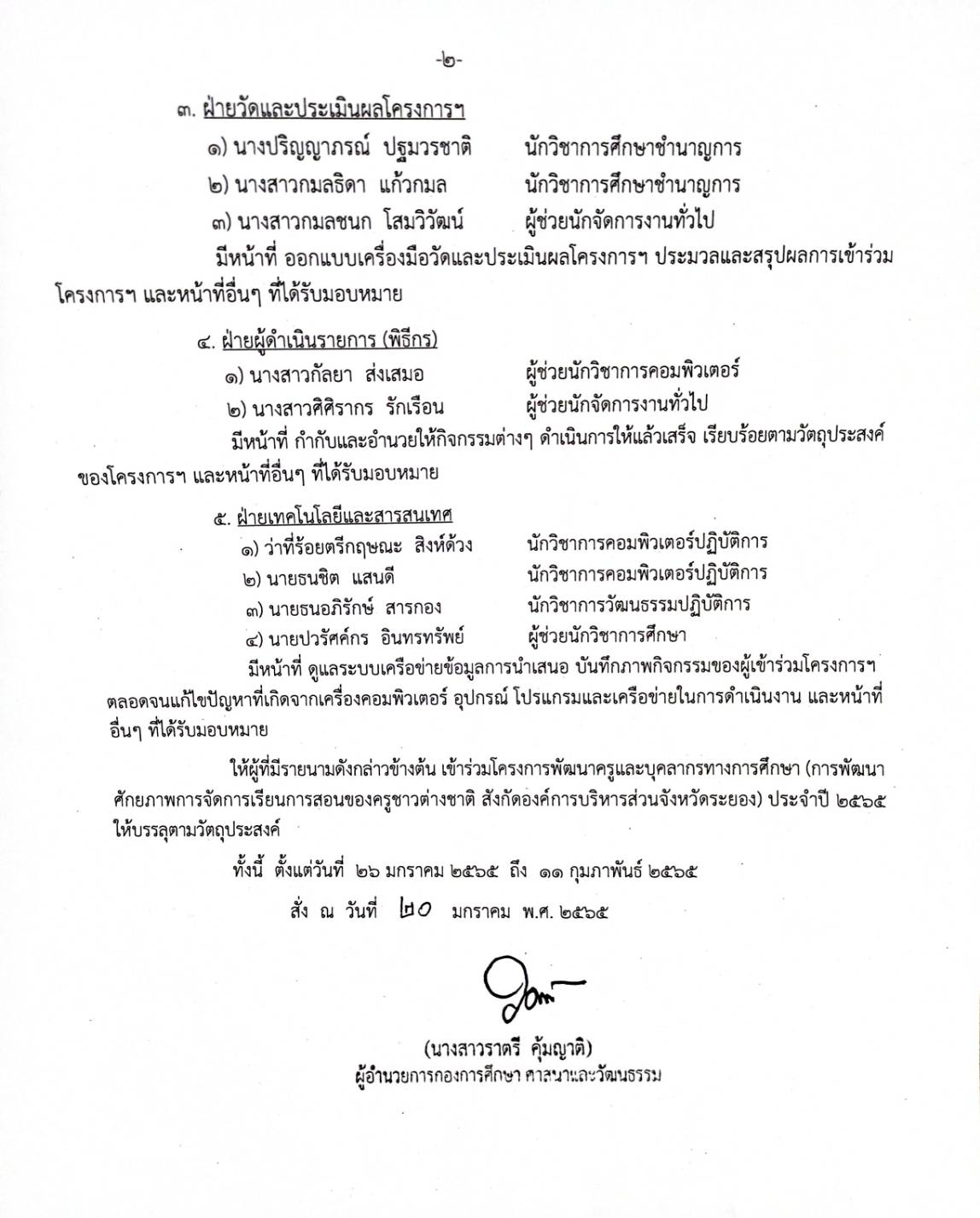 แจ้งประชาสัมพันธ์และคำสั่งกองการศึกษาฯ 2/2565 ด้วยฝ่ายบริหารการศึกษา จะดำเนินการจัดอบรมออนไลน์ผ่านระบบ Zoom โครงการพัฒนาครูและบุคลากรทางการศึกษา (การพัฒนาศักยภาพของครูชาวต่างชาติ สังกัดองค์การบริหารส่วนจังหวัดระยอง) ประจำปี 2565