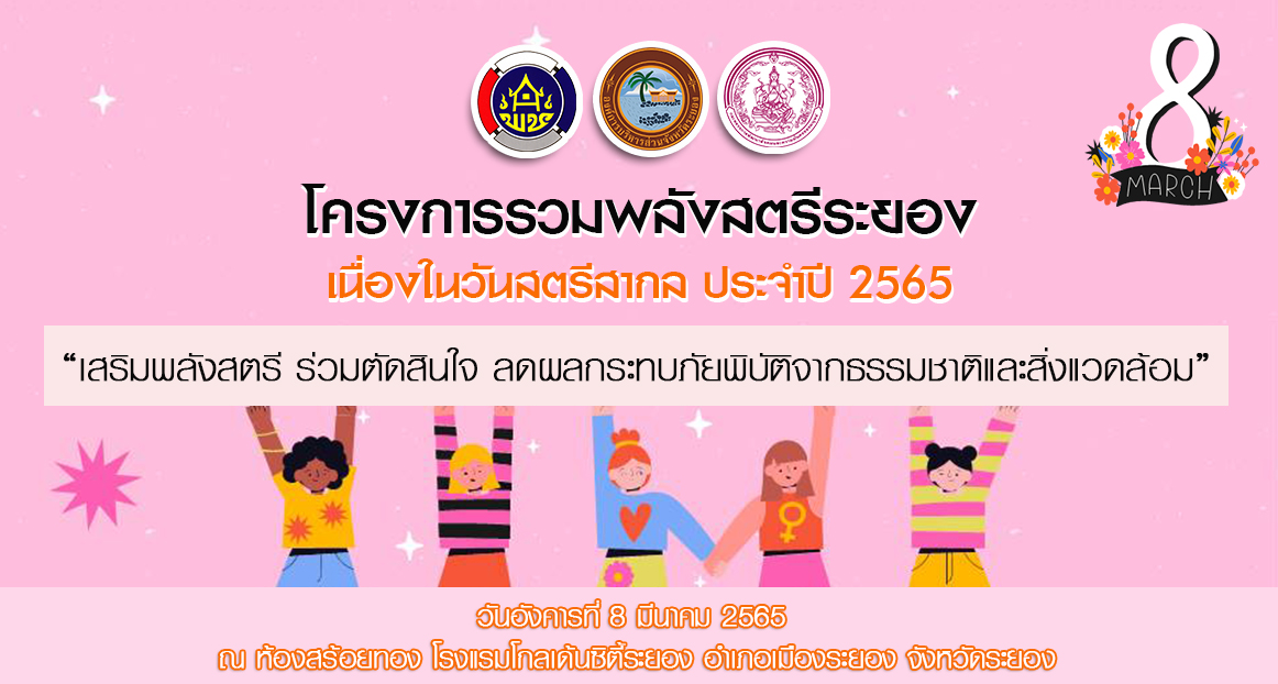 ขอเชิญร่วมโครงการรมพลังสตรีระยอง เนื่องในวันสตรีสากลประจำปี 2565 “เสริมพลังสตรี ร่วมตัดสินใจ ลดผลกระทบภัยพิบัติจากธรรมชาติและสิ่งแวดล้อม”