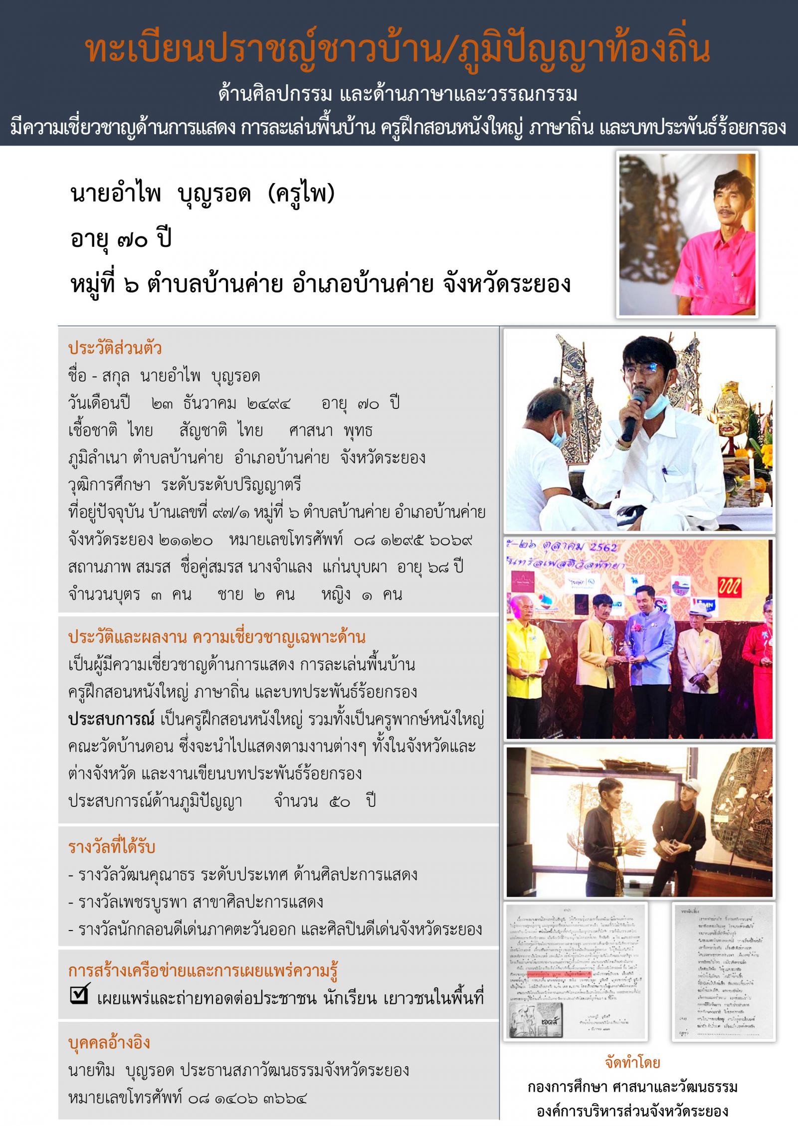 ทะเบียนปราชญ์ชาวบ้าน/ภูมิปัญญาท้องถิ่น ด้านศิลปกรรม ผู้มีความเชี่ยงชาญในด้านการแสดง การละเล่นพื้นบ้าน ครูฝึกสอนหนังใหญ๋ ภาษาถิ่น และบทประพันธ์ร้อยกรอง