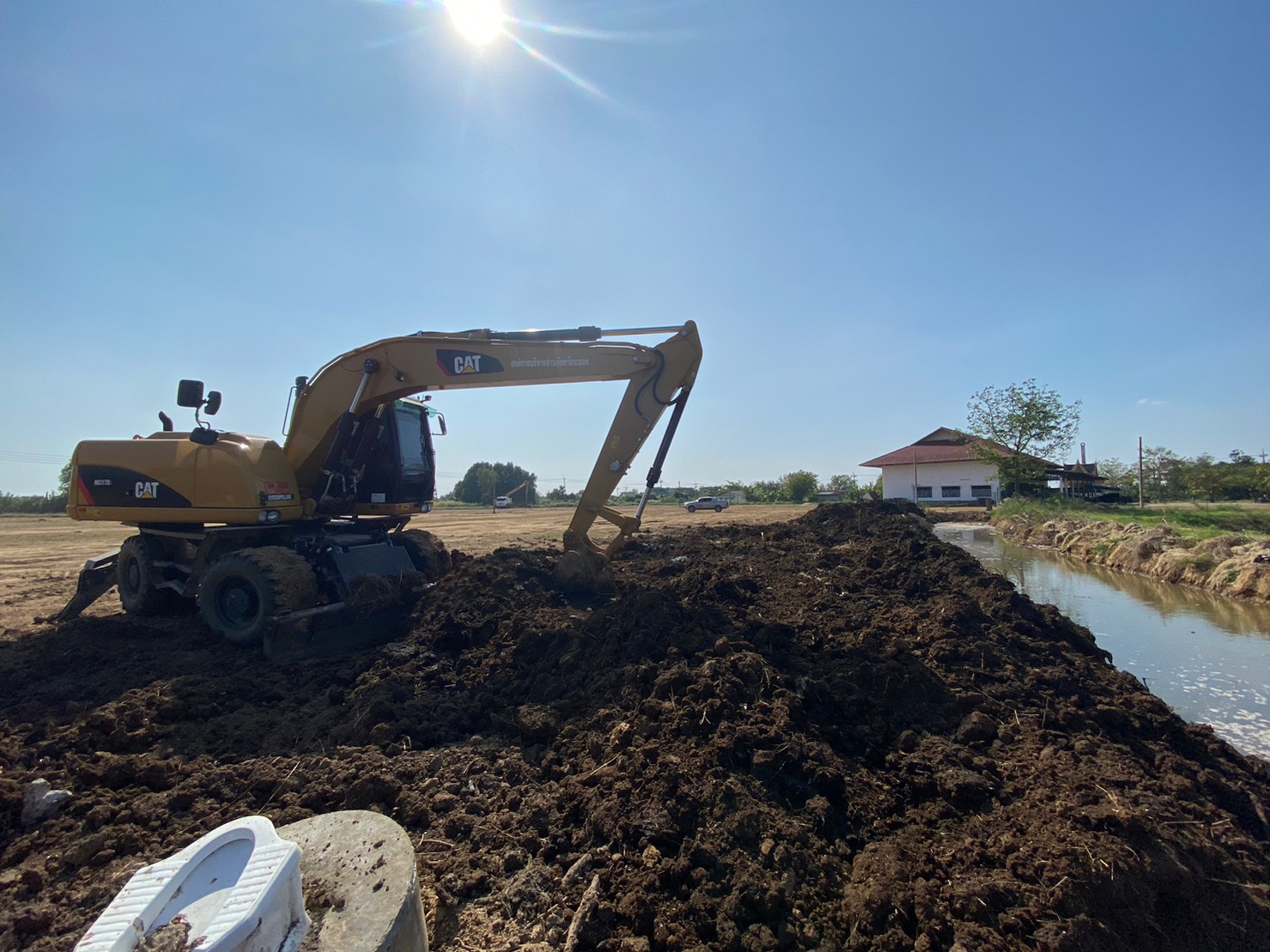 รถขุดไฮดรอลิคล้อยาง และรถฟาร์มแทรกเตอร์ตัดหญ้าไหล่ทาง เพื่อปรับพื้นที่ และ