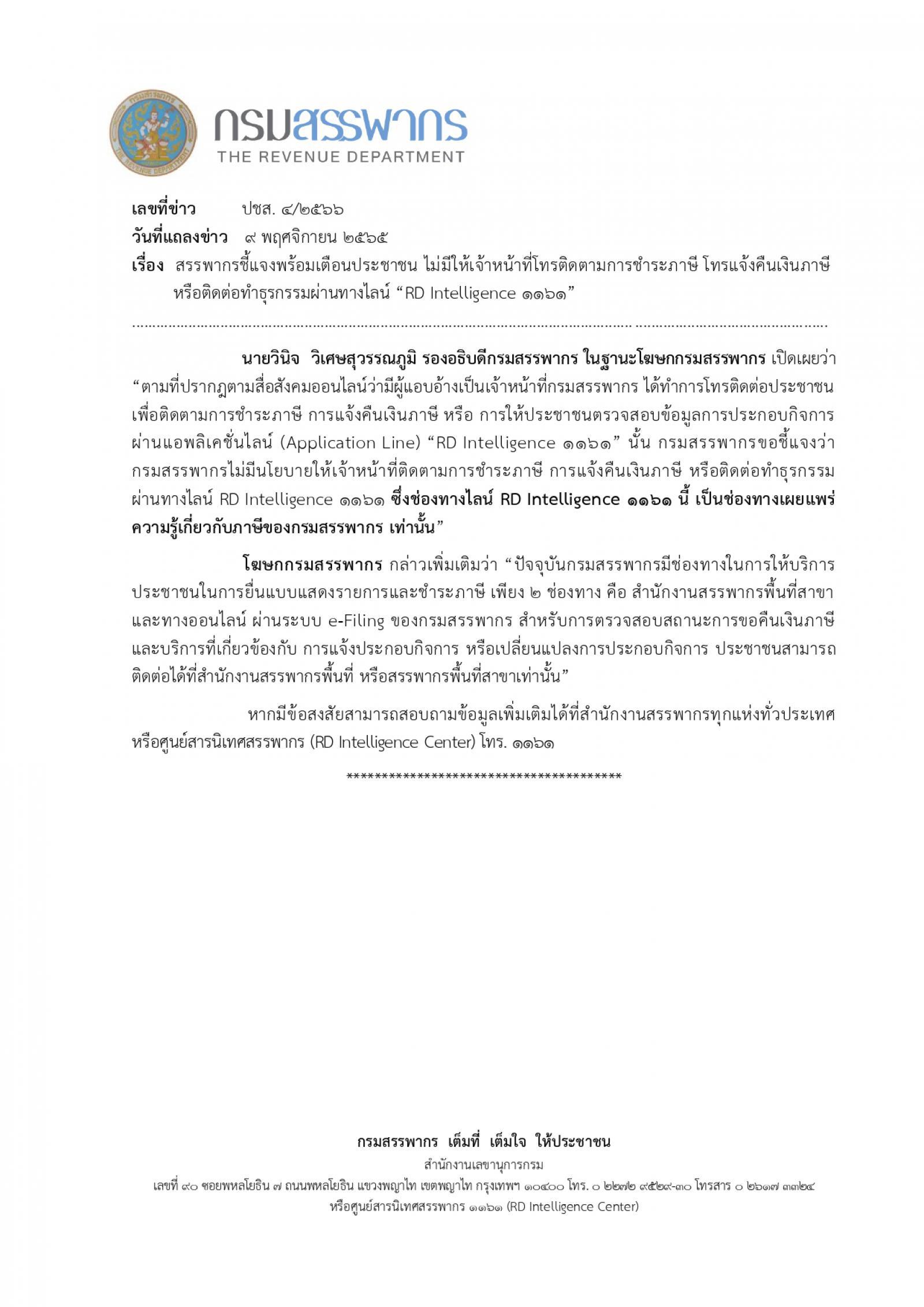 ด้วยกรมสรรพากร ไม่มีนโยบายให้เจ้าให้เจ้าหน้าที่ติดตามชำระภาษี การแจ้งคืนภาษี หรือติดต่อทำธุรกรรมผ่านทางออนไลน์ Intelligence 1161 แต่อย่างใด จึงประชาสัมพันธ์แจ้งเตือนและเผยแพร่ข่าวสารพร้อมทั้งสื่อภาพอินโฟกราฟฟิคเพื่อให้ประชาชนได้รับทราบและจะได้ไม่หลงเชื่อตกเป็นเหยื่อของมิจฉาชีพ