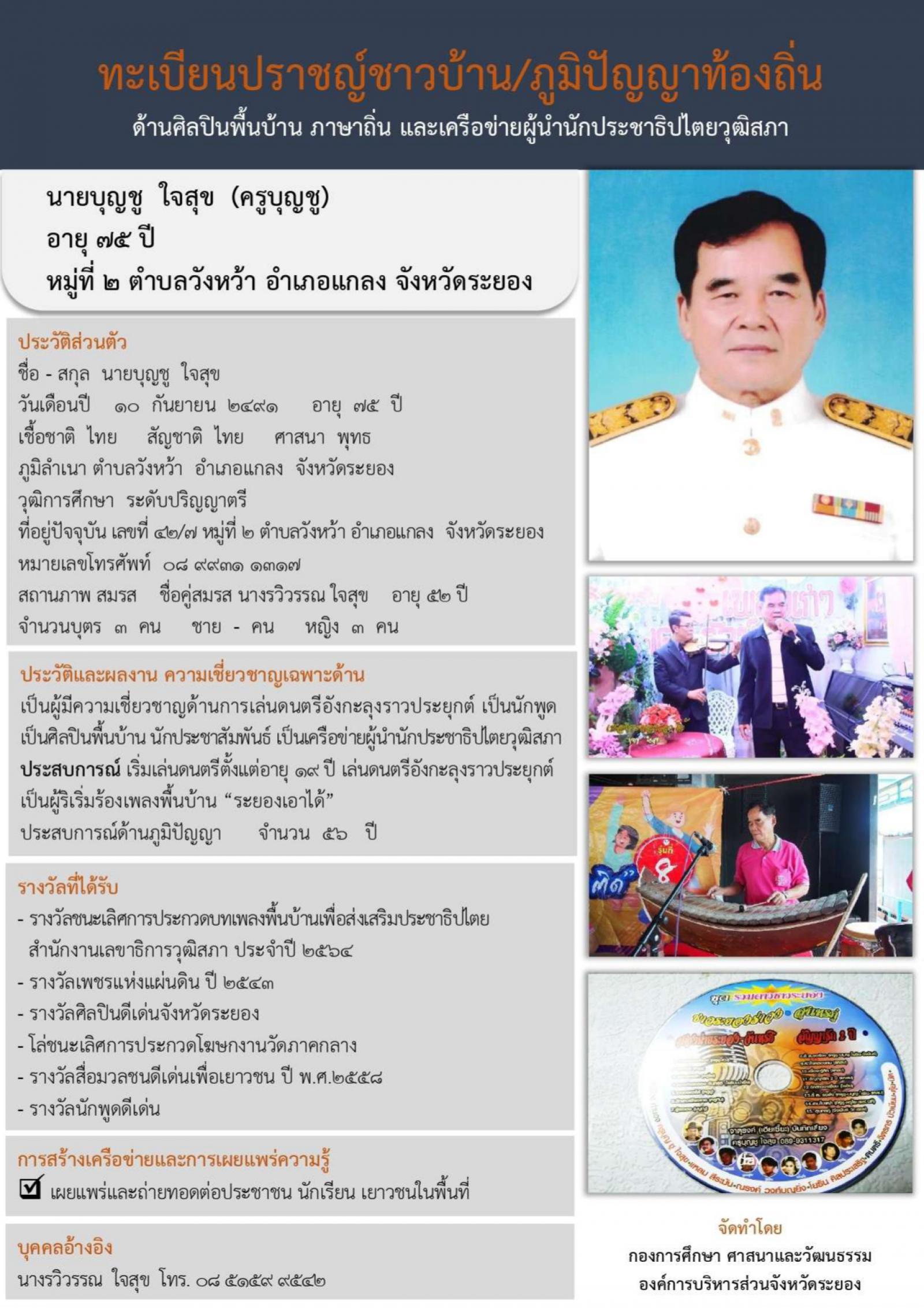 กองการศึกษา ศาสนาและวัฒนธรรม ได้จัดทำทะเบียนปราชญ์ชาวบ้าน/ภูมิปัญญาท้องถิ่นขึ้น เพื่อนำไปเผยแพร่ให้เกิดประโยชน์กับเด็ก เยาวชน ชุมชน ประชาชนในจังหวัดระยอง และประชาชนทั่วไป ได้ศึกษา เรียนรู้ต่อยอด สืบสาน อนุรักษ์ภูมิปัญญาท้องถิ่นที่สำคัญและมีประโยชน์ไว้ไม่ให้สูญหายไปจากจังหวัดระยอง