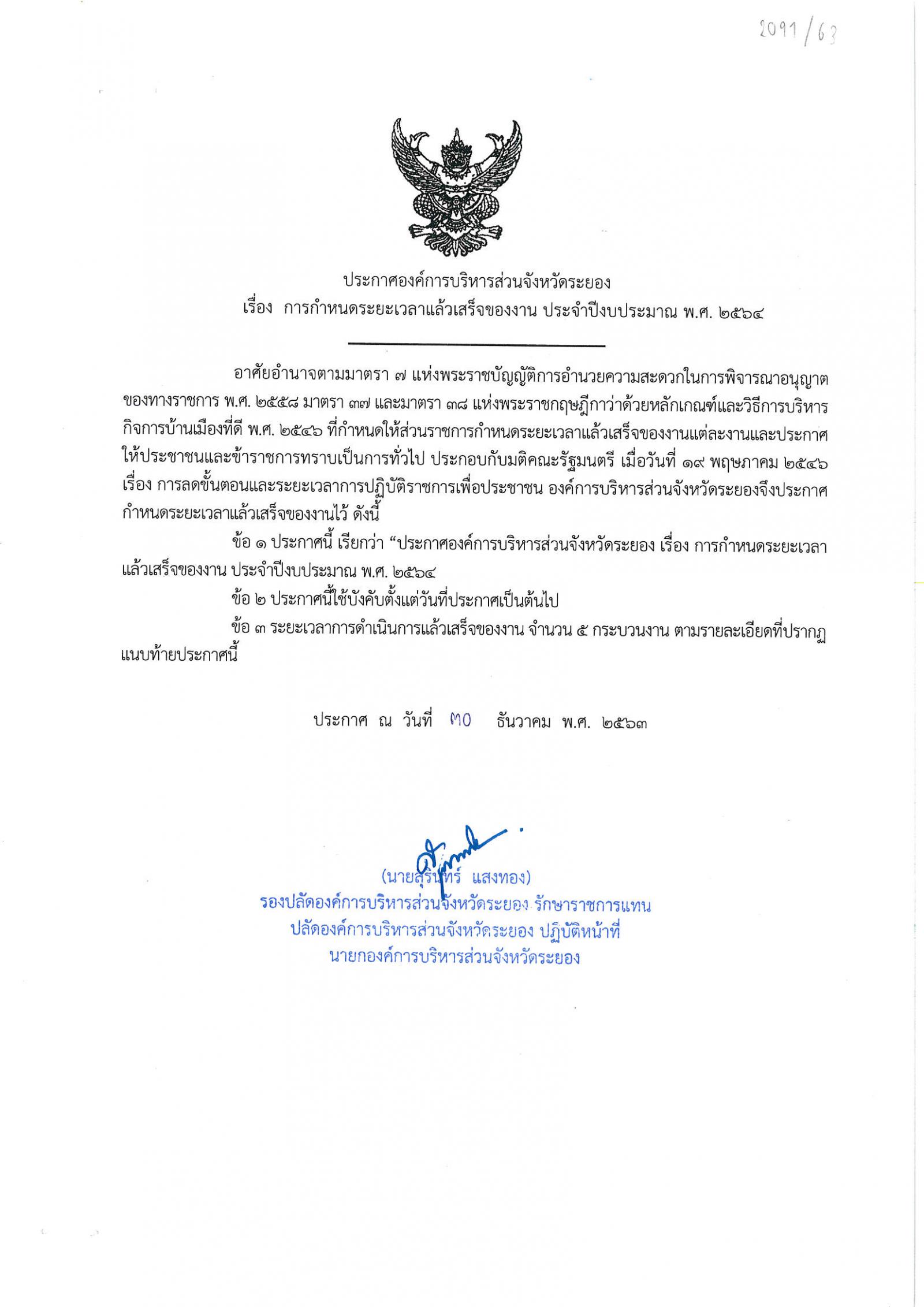 ประกาศ อบจ.ระยอง เรื่อง การกำหนดระยะเวลาแล้วเสร็จของงาน ประจำปีงบประมาณ พ.ศ.๒๕๖๔