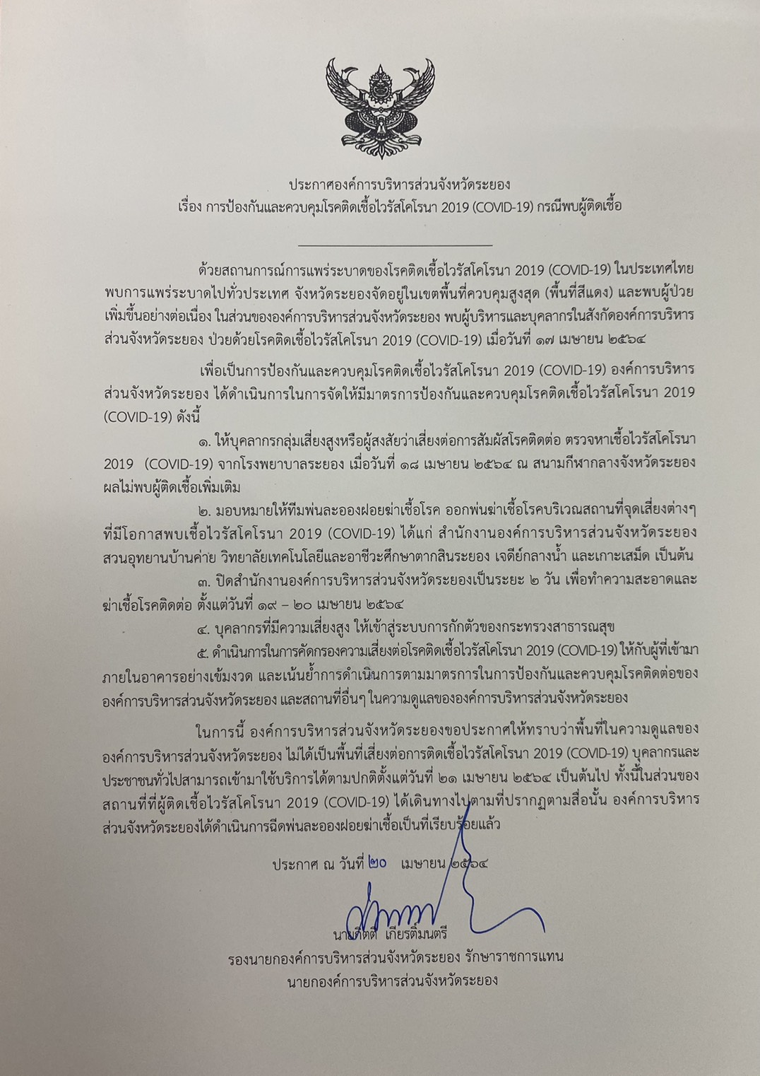ประกาศ อบจ.ระยอง เรื่อง การป้องกันและควบคุมโรคติดเชื้อไวรัสโคโรนา 2019 (COVID-19) กรณีพบผู้ติดเชื้อ
