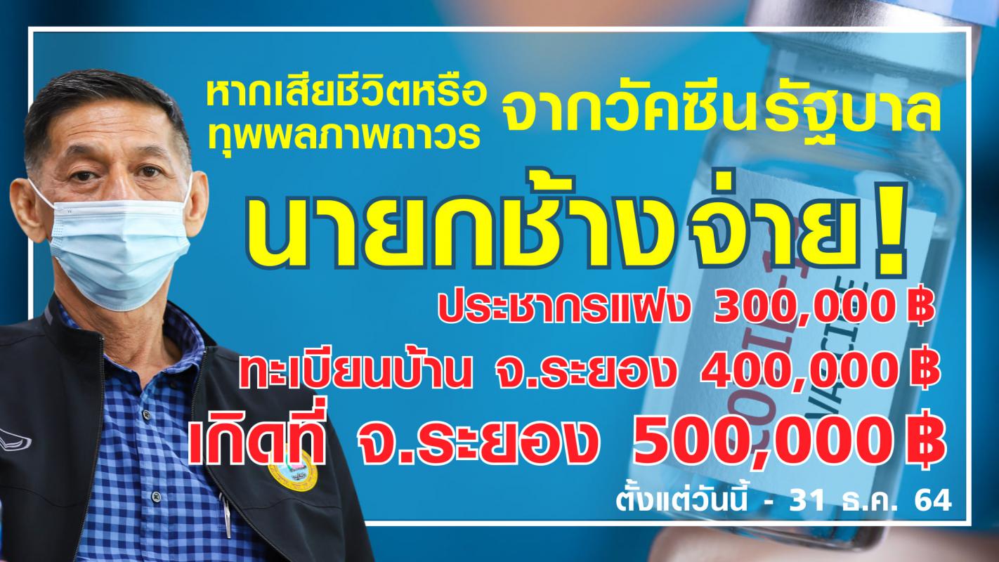 1.ฉีดวัคซีนโควิด-19ที่รัฐจัดหามาแล้วเสียชีวิต หรือทุพพลภาพถาวร ประชาชนที่อาศัยและมาทำงานใน จ.ระยอง (โดยมีหลักฐานยืนยันจากสถานที่ทำงานหรือหน่วยงาน) แต่ไม่มีทะเบียนบ้านอยู่ในระยอง จ่ายให้ 300,000 บาท ส่วนประชาชนที่มีทะเบียนบ้านอยู่ใน จ. ระยอง จ่ายให้ 400,000 บาท และ ประชาชนที่เกิดในจังหวัดระยองแท้ๆตามสูติบัตร จ่ายเพิ่มให้ 100,000 บาท เป็น 500,000 บาท หมายเหตุ การเสียชีวิตหรือทุพพลภาพถาวร ต้องเกิดจากการฉีดวัดซีนที่โรงพยาบาลของรัฐ จัดหาเท่านั้น และ แพทย์ได้ทำการพิสูจน์ว่าการเสียชีวิตหรือทุพพลภาพถาวร จากการฉีดวัดซีนจริงๆจึงจะได้รับเงินช่วยเหลือจากท่านนายก ปิยะ ปิตุเตชะ