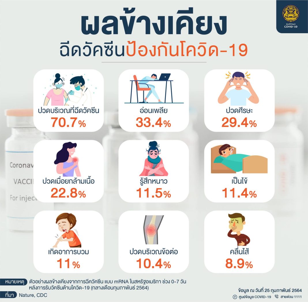 5. มีผลข้างเคียงจากการฉีดวัคซีนหรือไม่อาการทั่วไปหลักจากได้รับวัคซีน คือ อาการไข้หวัด เช่น มีไข้ ปวดกล้ามเนื้อ ปวดบริเวณที่ฉีด และรวมไปถึงอาการอ่อนเพลียด้วย ส่วนอาการข้างเคียงอื่น ๆ เช่น แพ้วัคซีน เป็นต้น ซึ่งเกิดขึ้นค่อนข้างน้อย