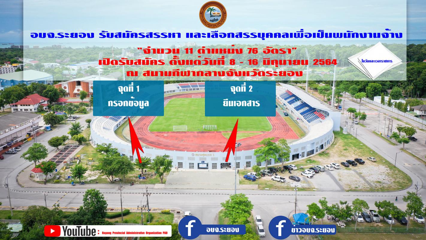 วันที่ 8 มิถุนายน 2564 เวลา 08.30 น. กองการเจ้าหน้าที่องค์การบริหารส่วนจังหวัดระยอง เปิดรับสมัครสรรหาและเลือกสรรบุคคลเพื่อเป็นพนักงานจ้าง สังกัดองค์การบริหารส่วนจังหวัดระยอง จำนวน 11 ตำแหน่ง 76 อัตรา ณ สนามกีฬากลางจังหวัดระยอง โดยเริ่มทำการรับสมัครตั้งแต่วันที่ 8-16 มิถุนายน 2564 ในวันและเวลาราชการ ทั้งนี้ สามารถสอบถามรายละเอียดเพิ่มเติมทางโทรศัพท์ หมายเลข 0-3861-7430 ต่อ 711 หรือดูรายละเอียดประกาศได้ที่ FB:อบจ.ระยอง เว็บไซ http://new.rayong-pao.go.th/