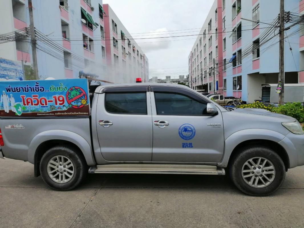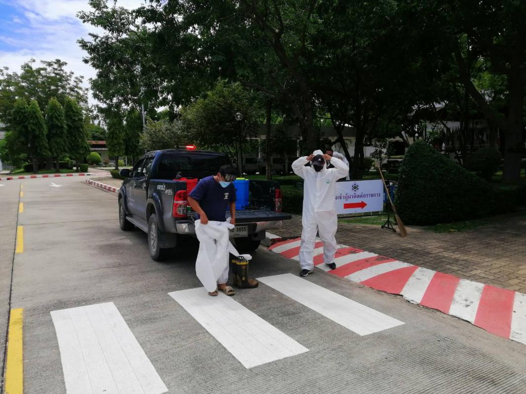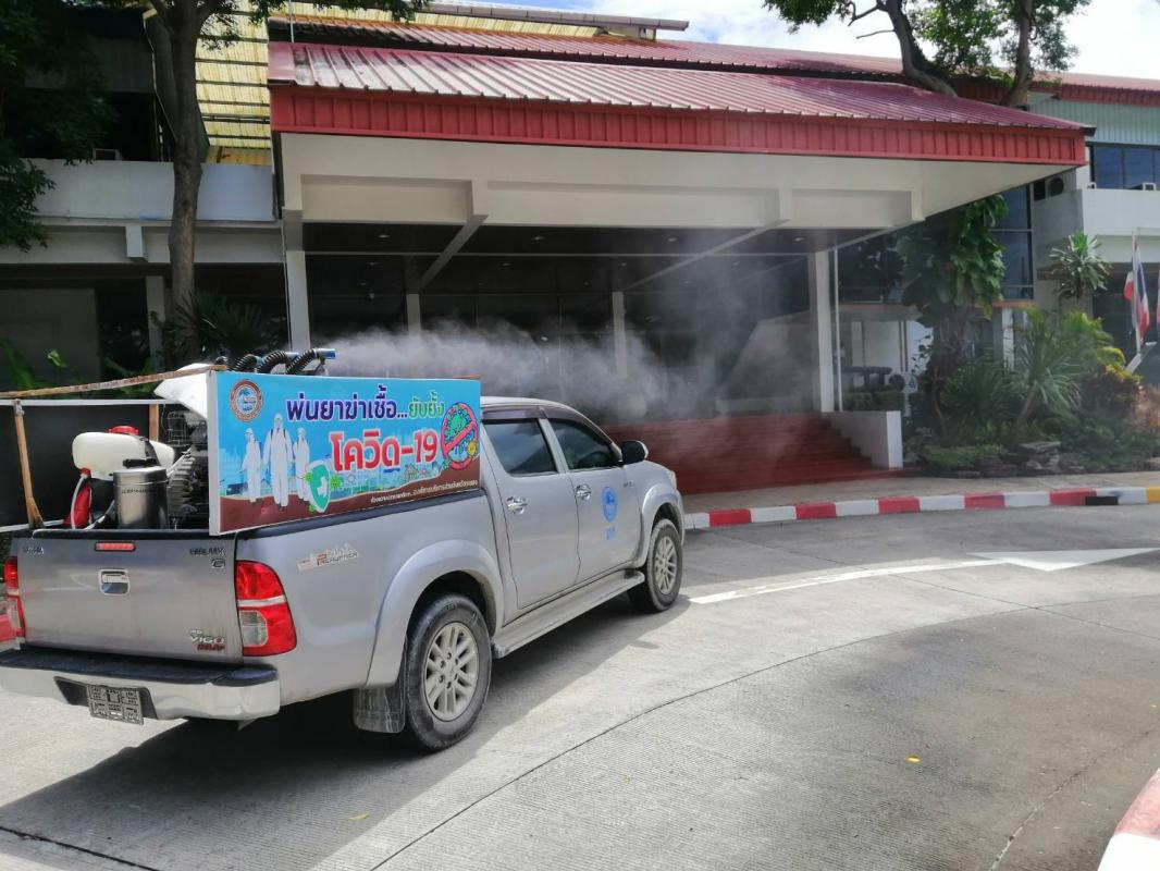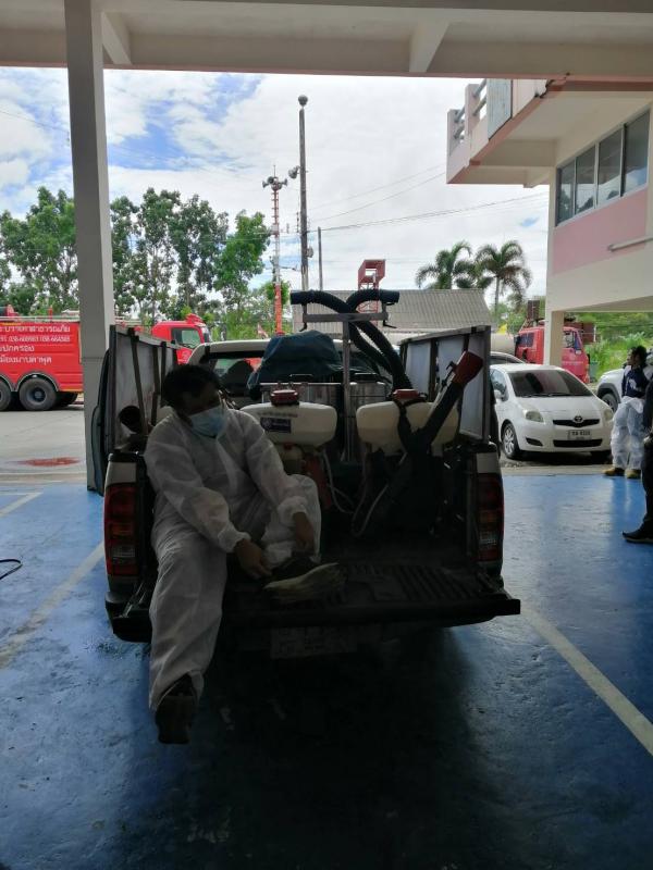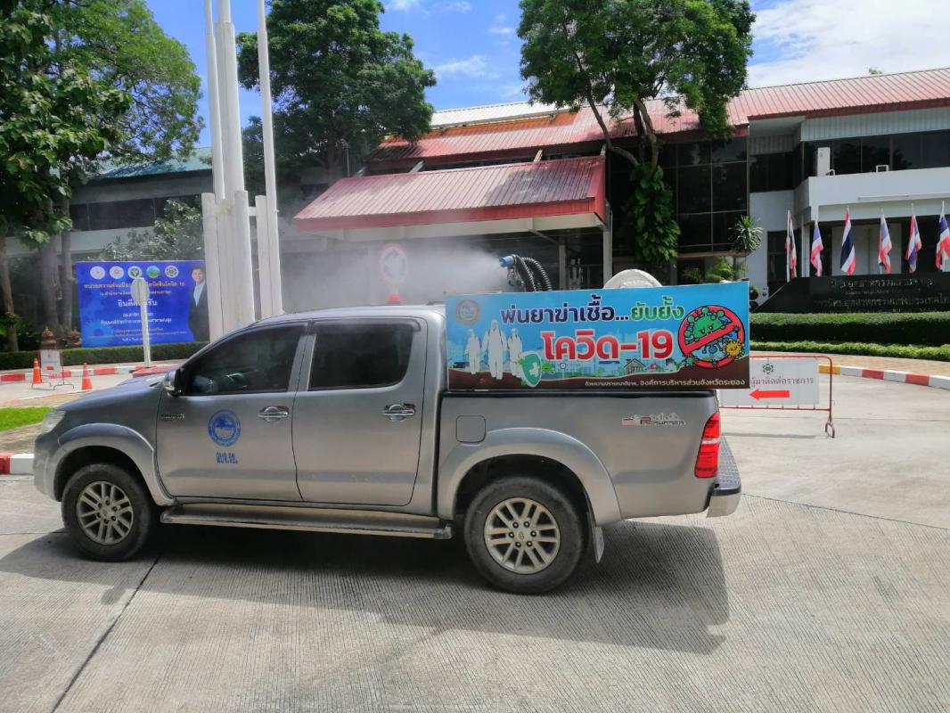 ทำการฉีดพ่นน้ำยาฆ่าเชื้อ โควิด-19 โดยฝ่ายป้องกันและบรรเทาสาธารณภัย อบจ.ระยอง